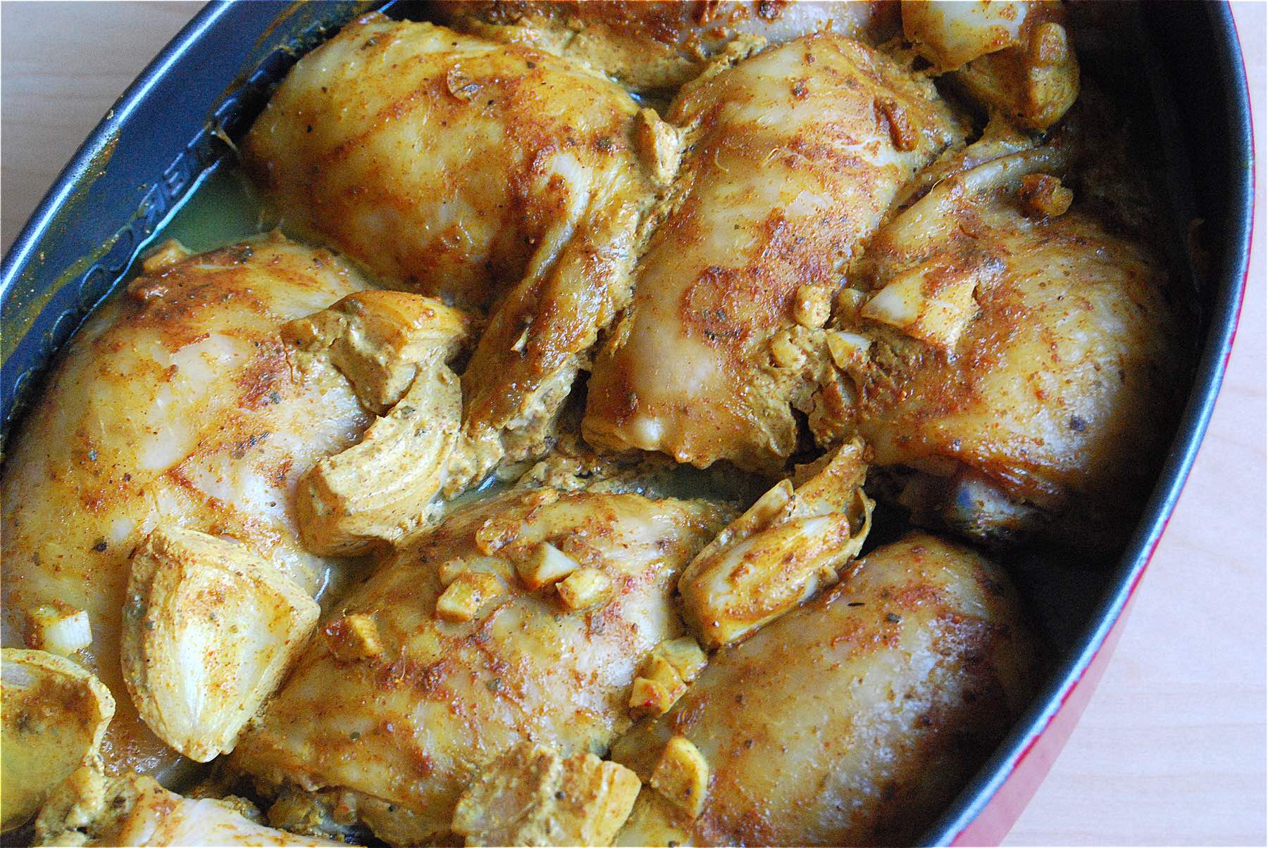 C’est du poulet mariné donc il y a rien de sorcier. On met tout dans un bol à mariner et le lendemain on met au four et hop, fini. Parfait pour un dîner de semaine ou on a pas envie de se prendre la tête. On prépare la veille et quand on rentre du boulot on enfourne.