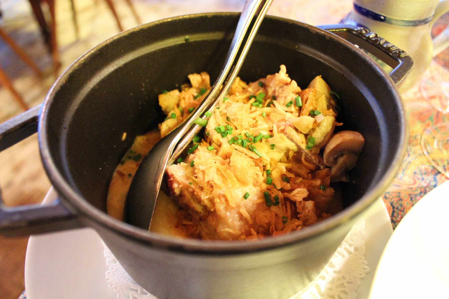 Ensuite, j’ai picoré en face de moi dans une généreuse cocotte remplie de coq au riesling, servie avec des spätzles! En buvant du riesling… Bien sûr! La viande est tendre, goûteuse, la sauce avec les petits champignons accompagnent parfaitement les spätzles. Que dire de plus ?