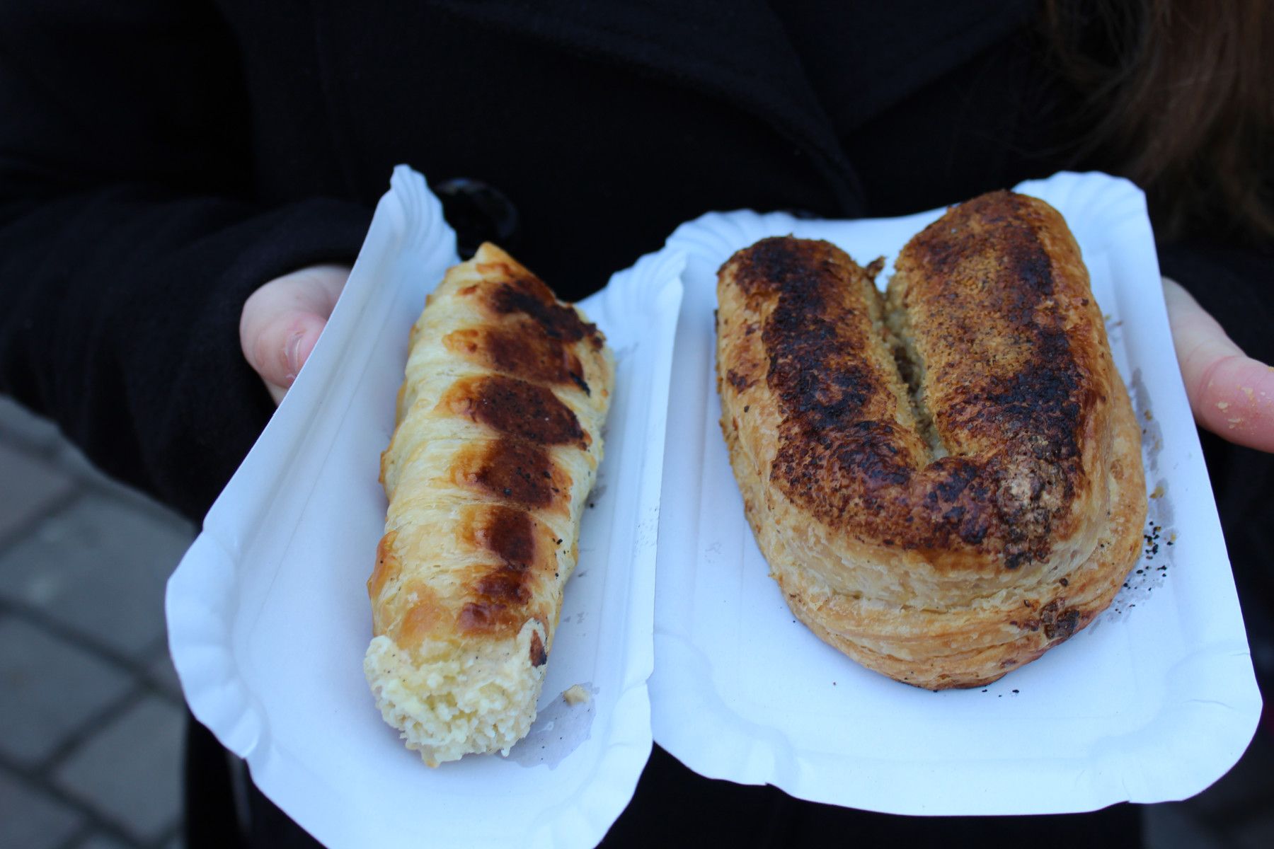 Ça, c’est des feuilletés qu’on a acheté au City Park devant le musée. Il y en a un fourré au fromage et à la crème fraîche et l’autre est sucré, il est fourré d’une crème à la noisette et à la cannelle. C’est servi tiède et c’est trop bon. Environ 2 euros les deux.