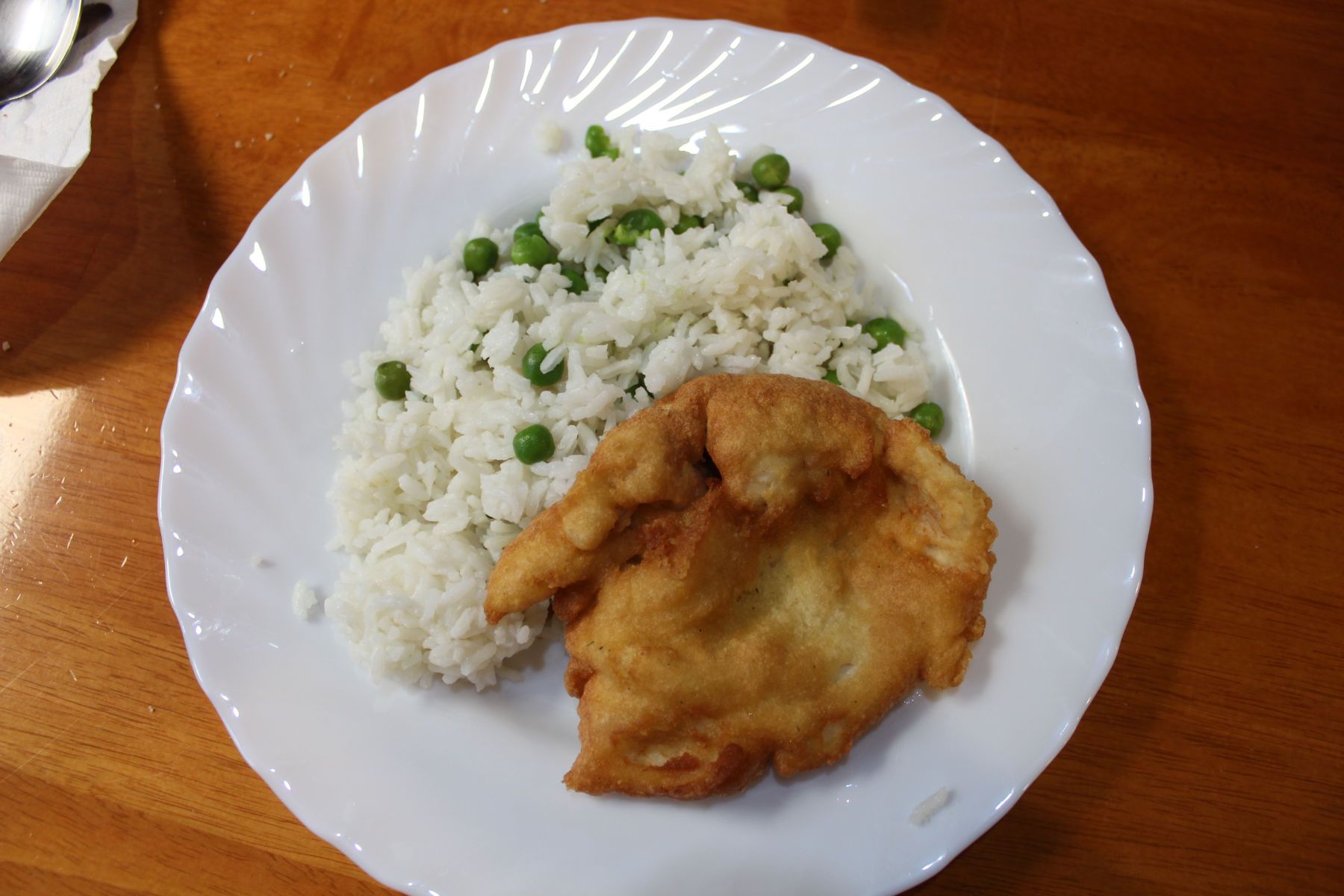 Un plat bien typique là aussi, un morceau de poulet frit et du riz aux petits pois. Simple et efficace.