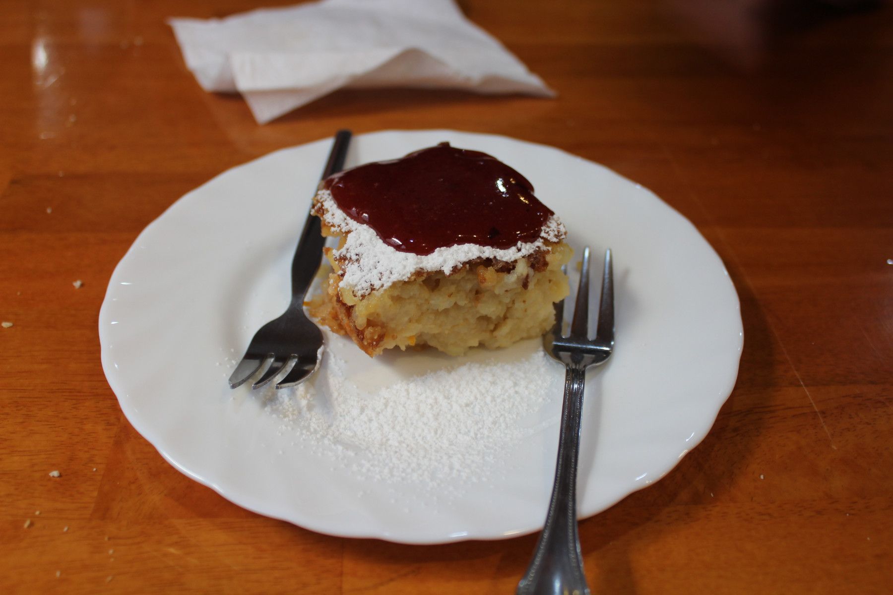 Le dessert c’est un genre de gâteau de riz recouvert de sucre glace et d’un coulis SUPER sucré (un peu trop). Le gâteau en lui même est délicieux mais le coulis un peu too much pour nos palets de touristes.