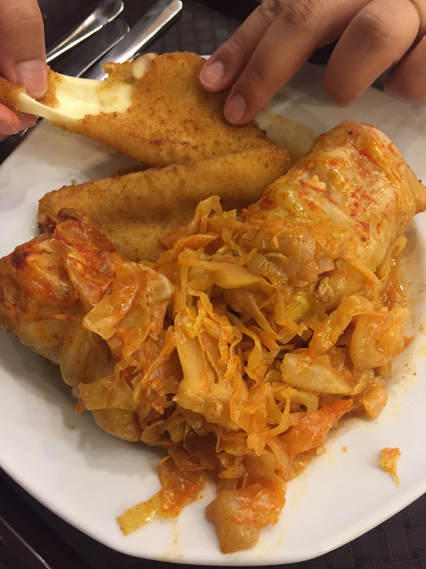Deux choses ici, des choux farcies absolument délicieux. Ils mangent beaucoup de choux en Hongrie. Et des fromages panés : miam miam.