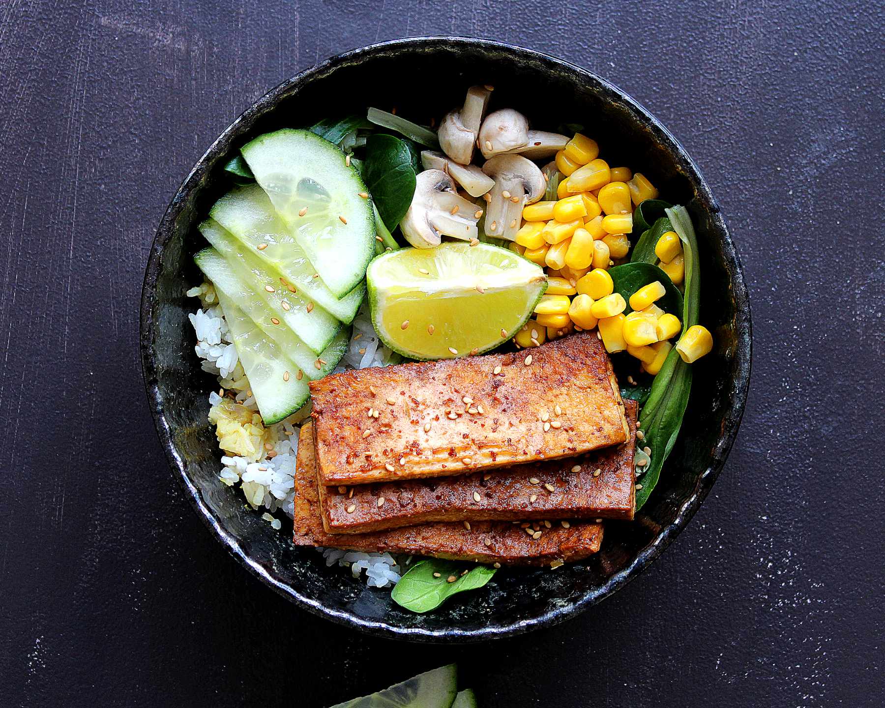 Après j’ai jeté un peu tout ce que j’avais dans mon frigo dans mon bol, du riz, de la mâche, du maïs en boîte, des concombres, des petits champignons poêlés, quelques graines de sésame et hop! Un repas équilibré et super rapide.