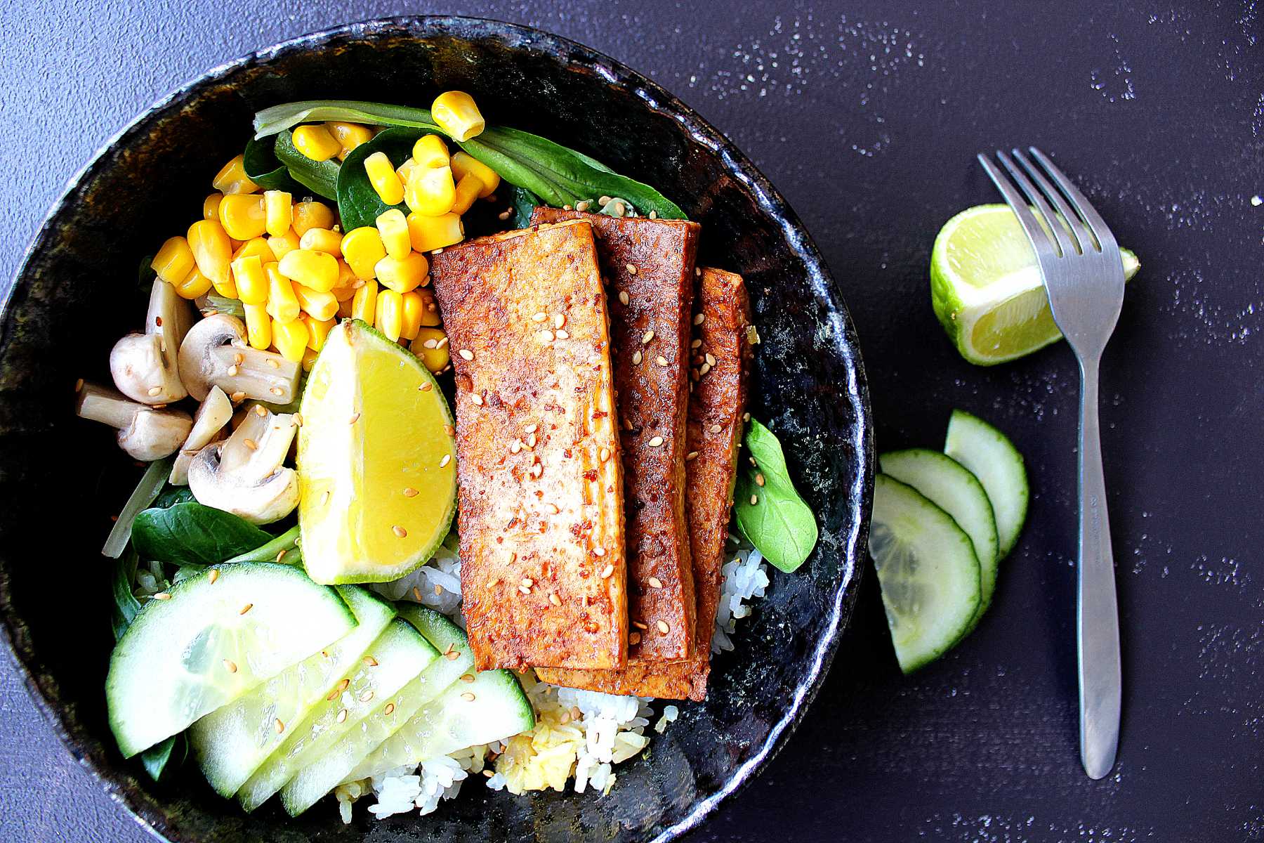 C’est la première fois que je cuisine du tofu. J’en avais déjà mangé (au resto majoritairement) mais jamais préparé moi-même. Mais cette semaine pas le choix : pendant que mon mari jeûne (il a essayé de me convaincre mais non merci) moi je me fais une semaine végane et j’augmente +++ le nombre de fruits et légumes!