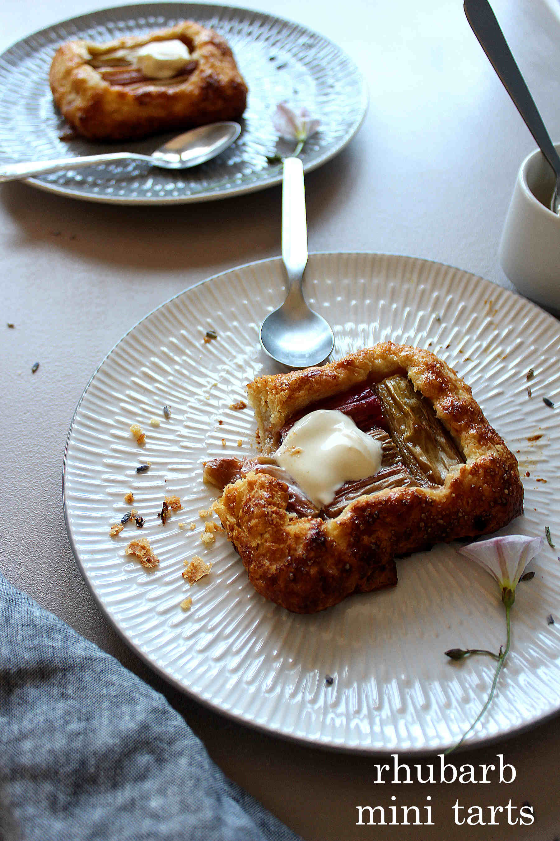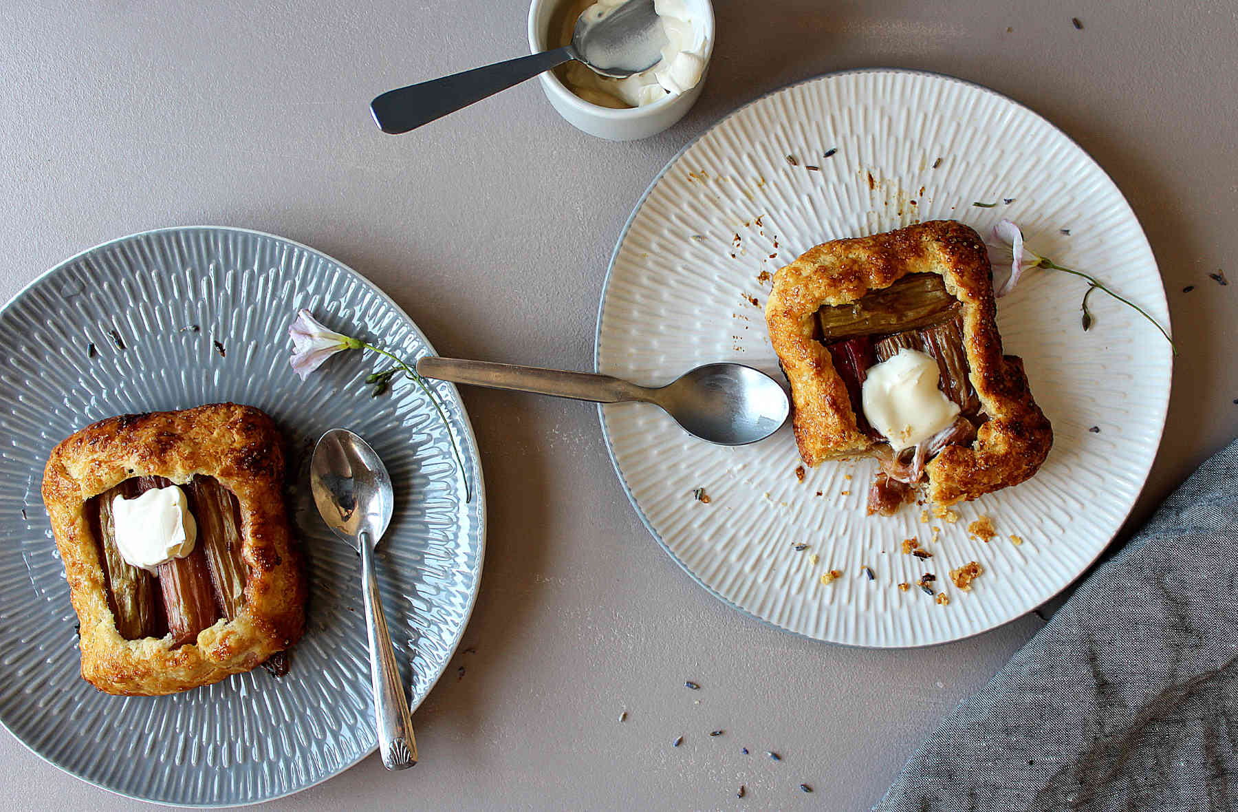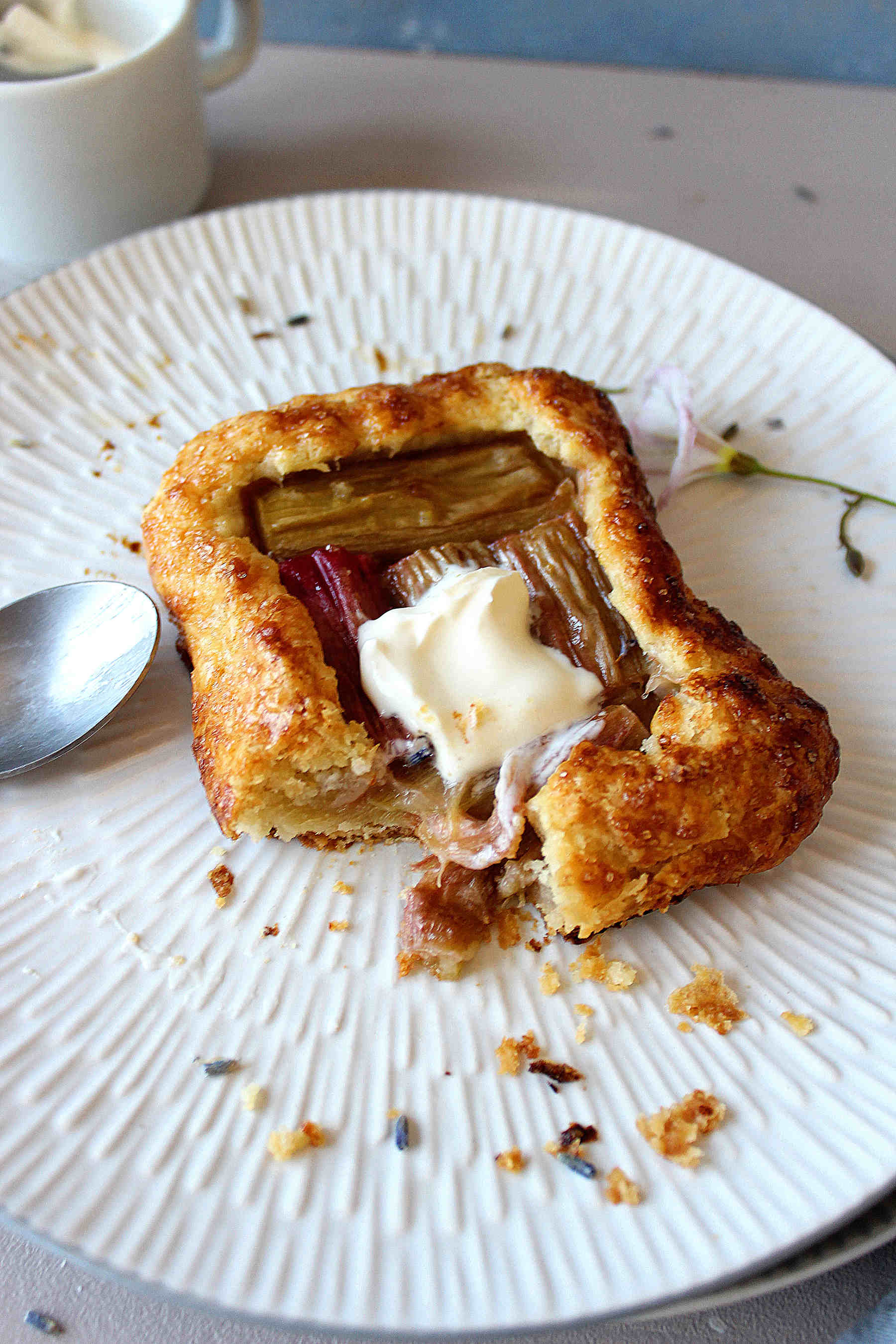 Des petites tartelettes à la rhubarbe pour profiter de la délicieuse et courte saison de la rhubarbe. Elles ont un look un peu rustique mais j’aime bien. En plus, il y a pas mal de pâte autour donc les textures sont bien équilibrées.