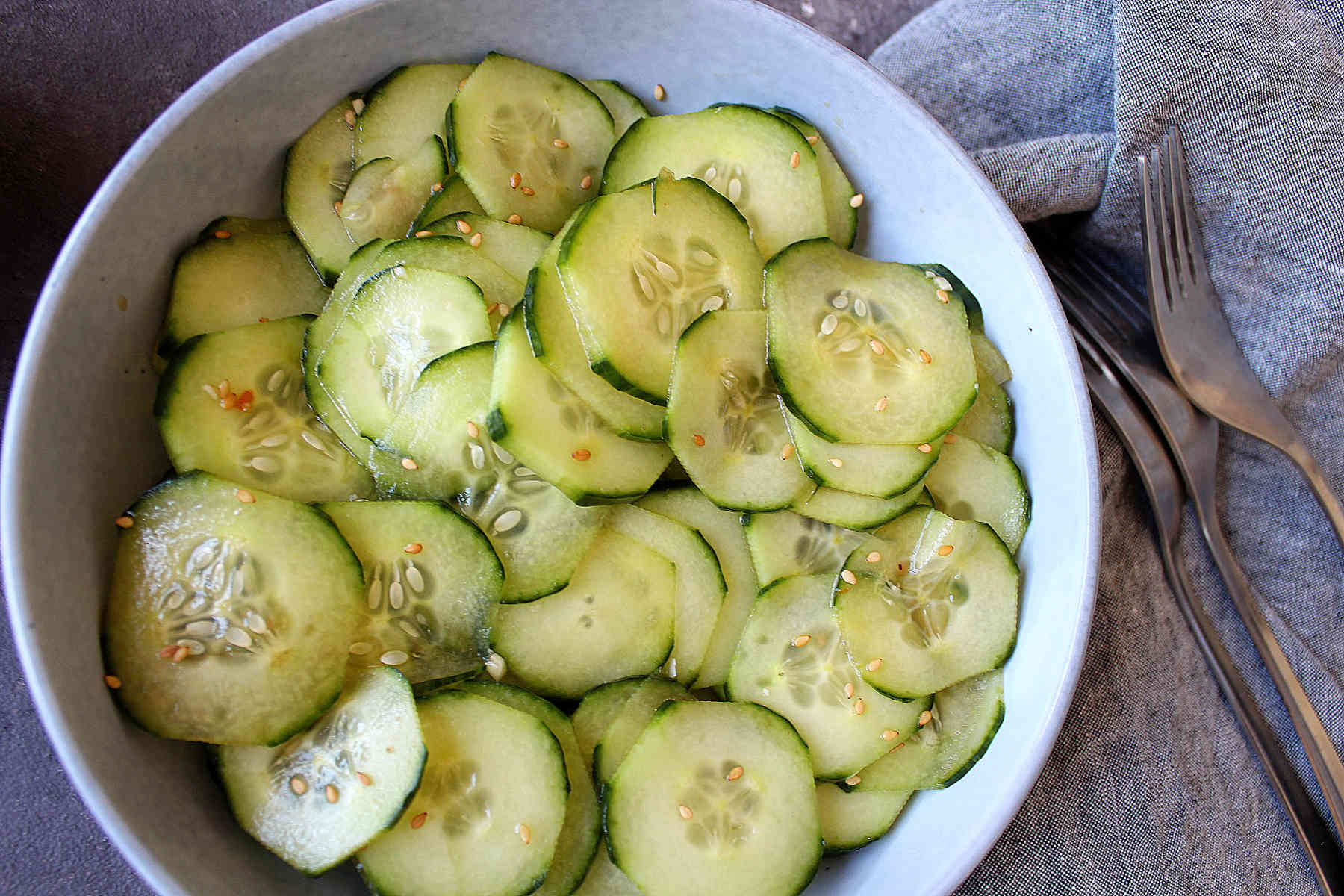 Les jours se suivent et l’été se fait très chaud ici à Lyon. Alors on innove, on change de mes concombres à la crème adorés pour des concombres d’inspiration asiatique avec pleins de bonnes choses et même un peu de piment pour relever tout ça.