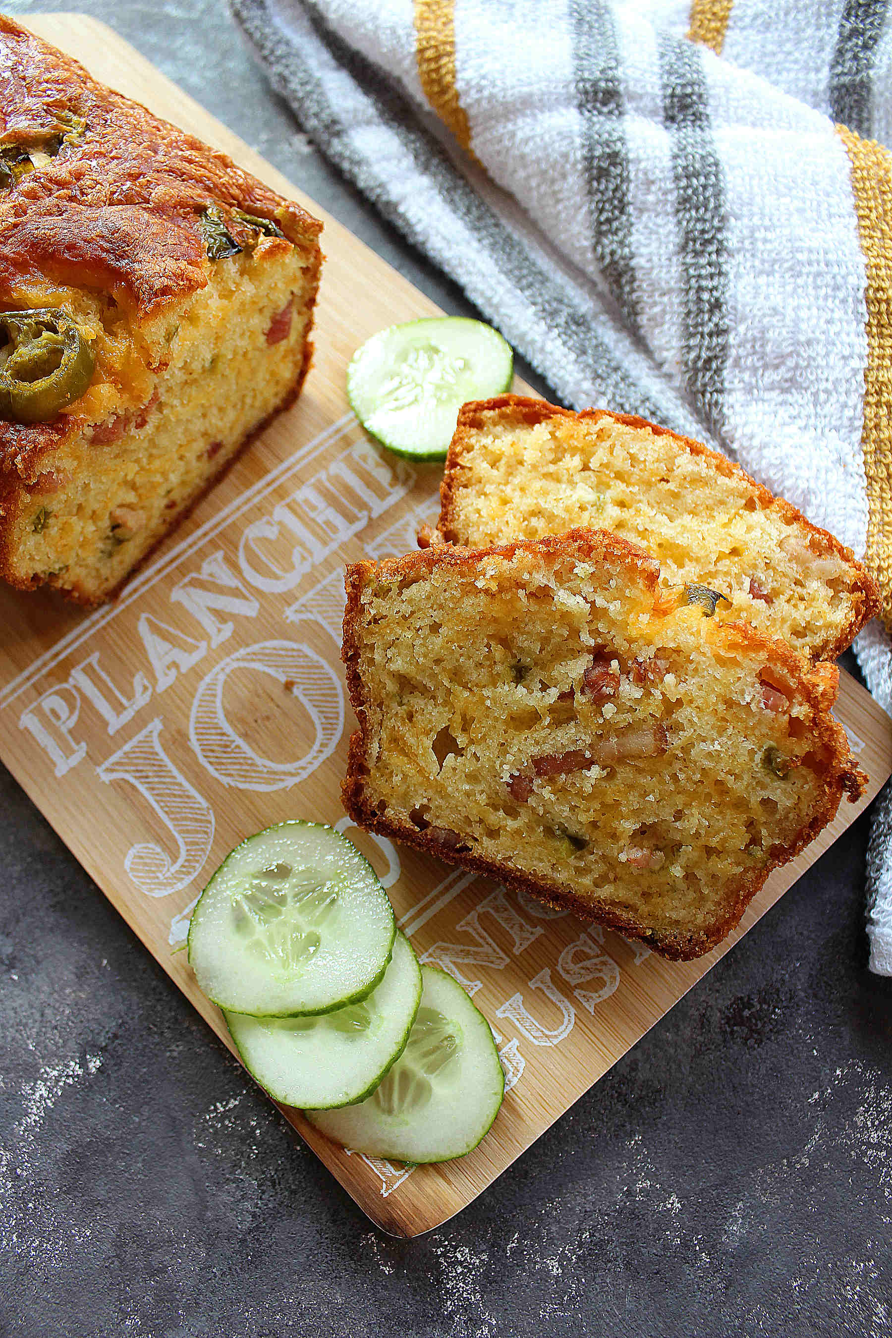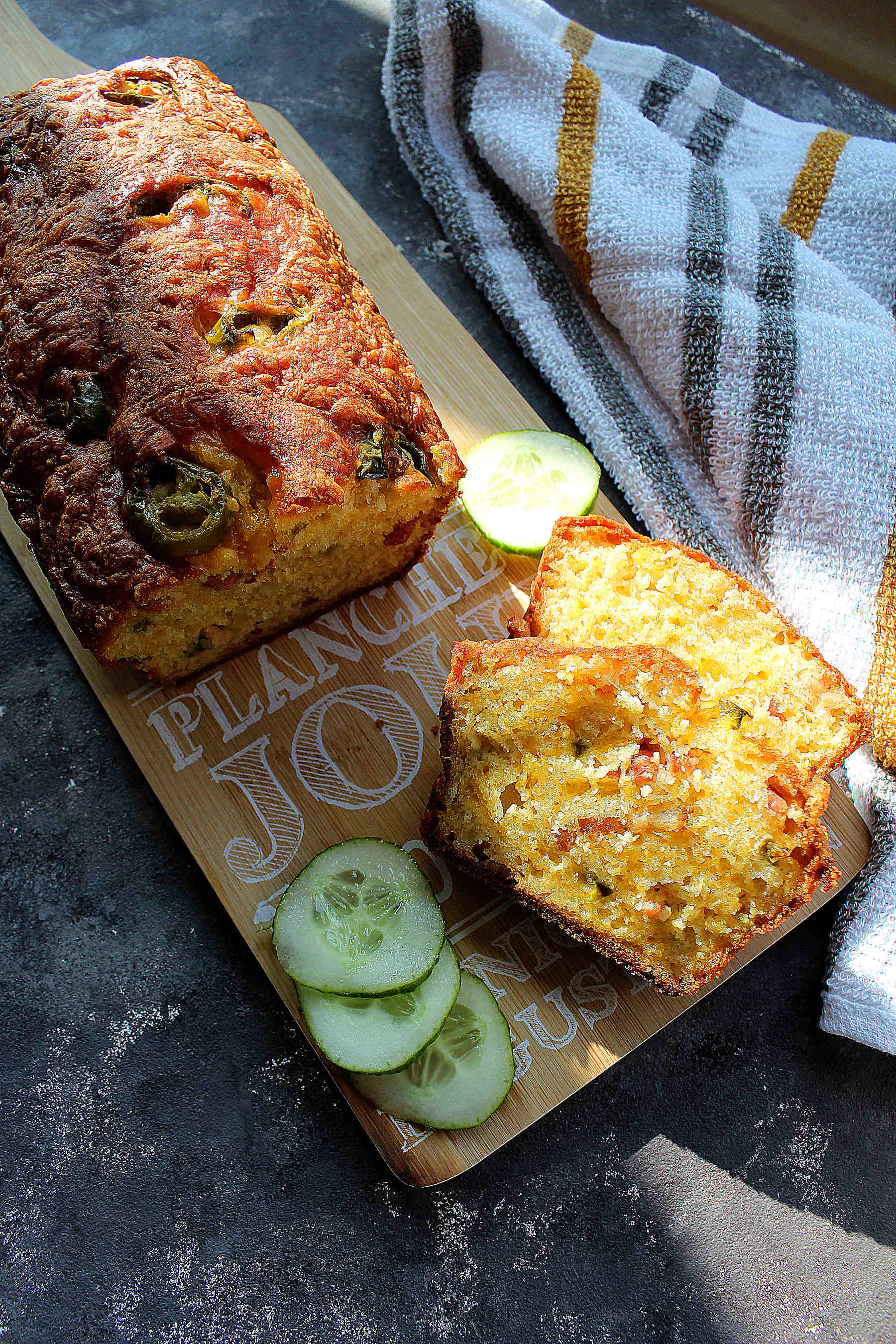 Un petit cake salé, c’est génial pour un dîner léger accompagné d’une salade ou un déjeuner rapide! Ça se mange chaud ou froid. Celui-ci est au piment jalapeño, au cheddar et aux petits lardons. J’ai vraiment apprécié ce combo relevé!