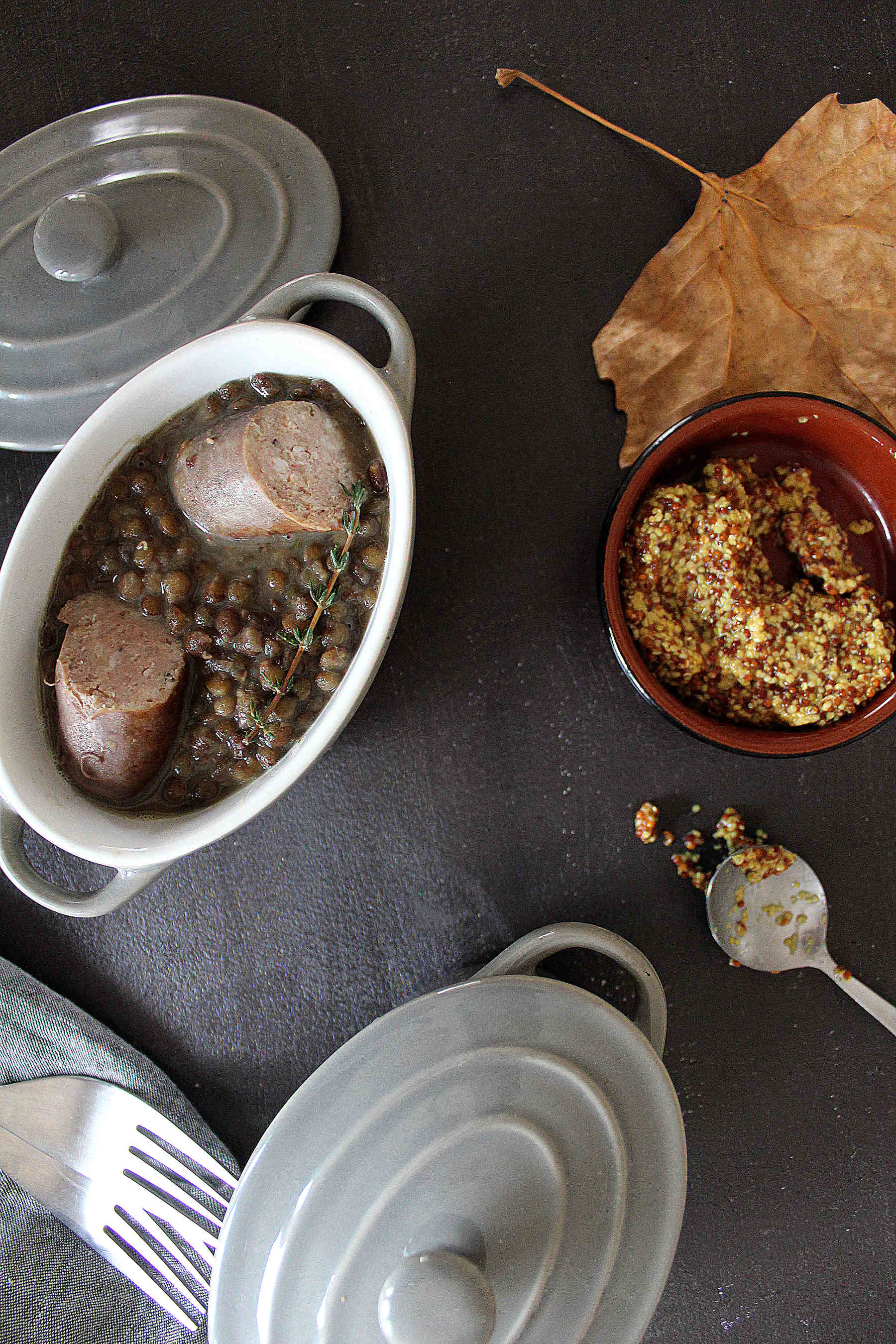 J’ai ajouté un peu de thym pour donner encore plus de saveurs à ce plat, vous pourriez aussi mettre du laurier si vous en avez! Si vous préférez les saucisses fumées, ce sera tout aussi délicieux. Et la moutarde à l’ancienne pour servir c’est incontournable, c’est tellement bon avec les lentilles… Miam!