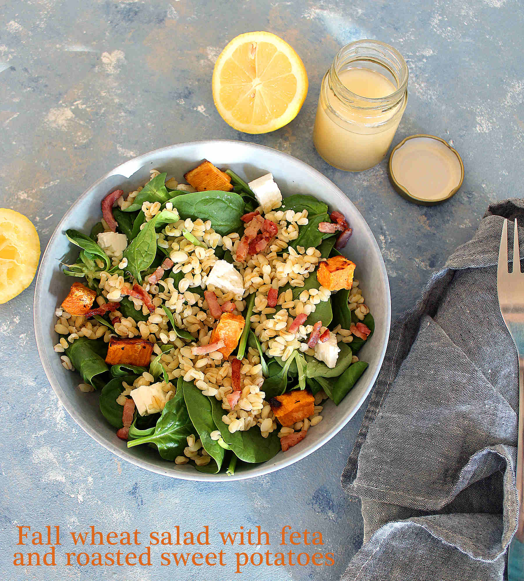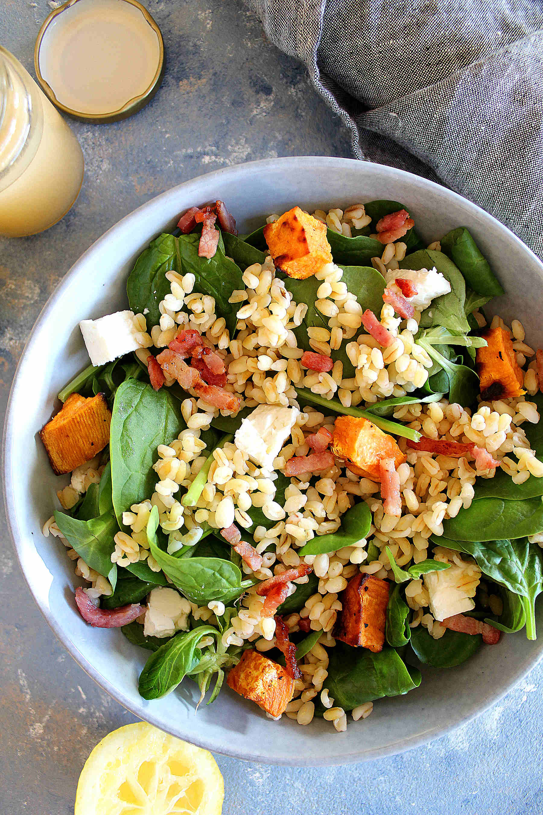 Salade de blé automnale à la féta, patate douces rôties et lardons (2-3 personnes) :