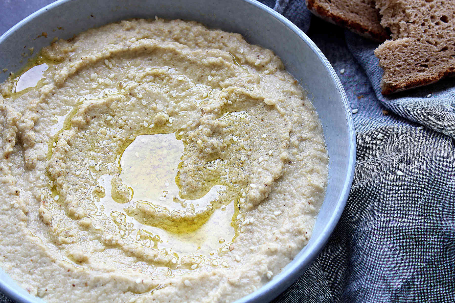Dans un mixeur ou blender, ajoutez le jus de citron, l’ail, la chair d’aubergine, le tahini et le sel.