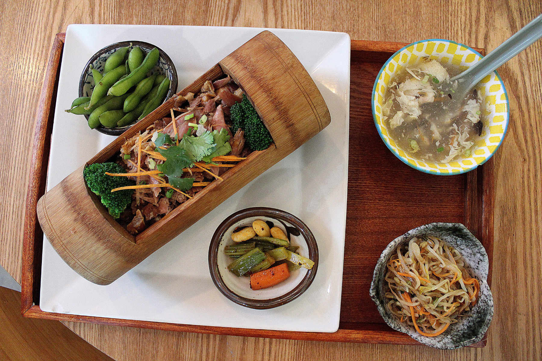 Le dernier plat que l’on a goûté fait partie des plats servis dans un tronçon de bambou, c’est super joli et ça fait hyper exotique. On a donc pris le B1 Bento canard (18,80€). C’est servi avec une généreuse couche de riz en dessous de la très généreuse couche de canard effiloché. Servi avec de l’edamame, des petits pickles de légumes, une salade de soja et une soupe.