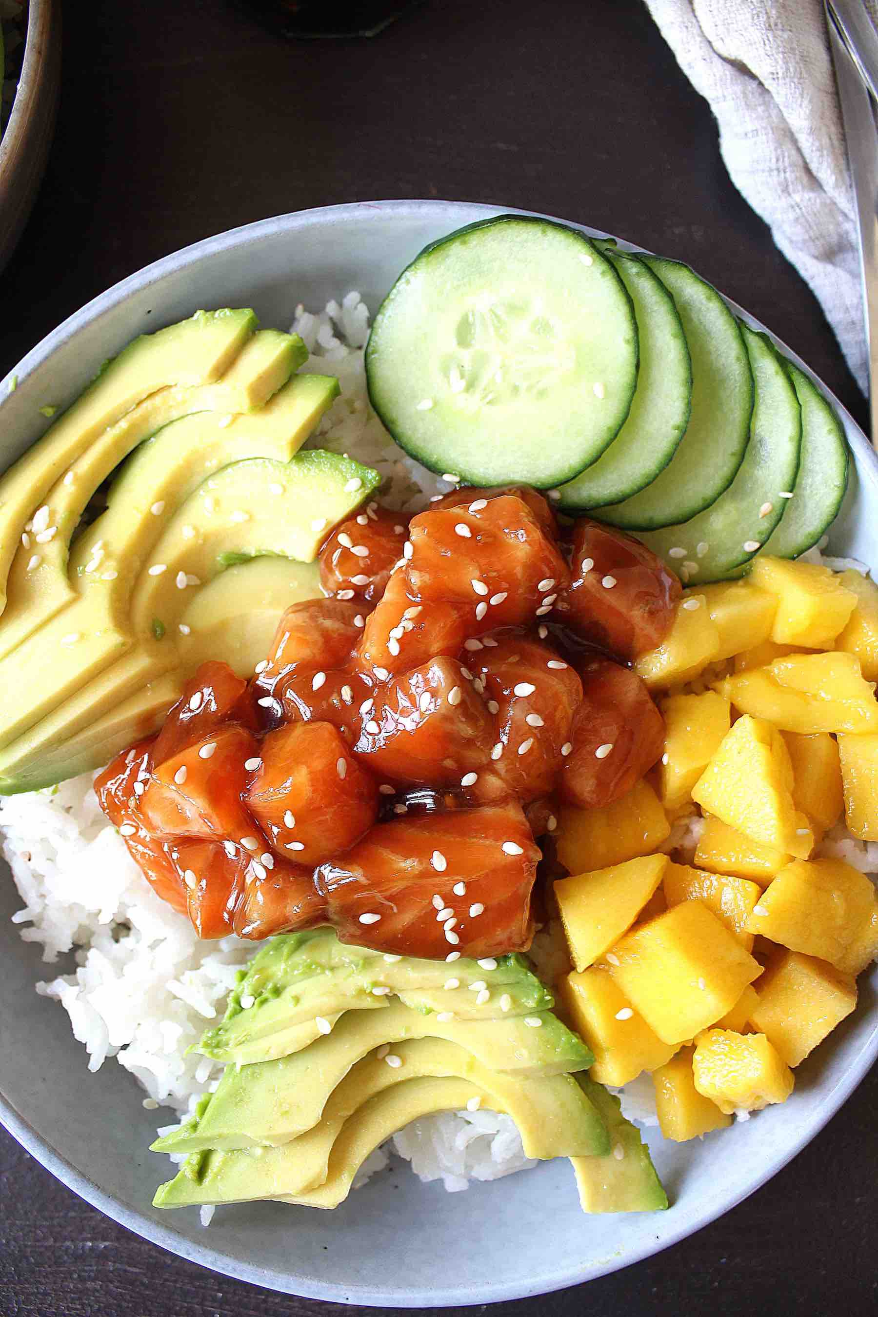 Un peu d’été dans votre bol avec ce délicieux poke bowl au saumon avec une sauce teriyaki maison et de la mangue bien fraîche, le voyage est garanti.