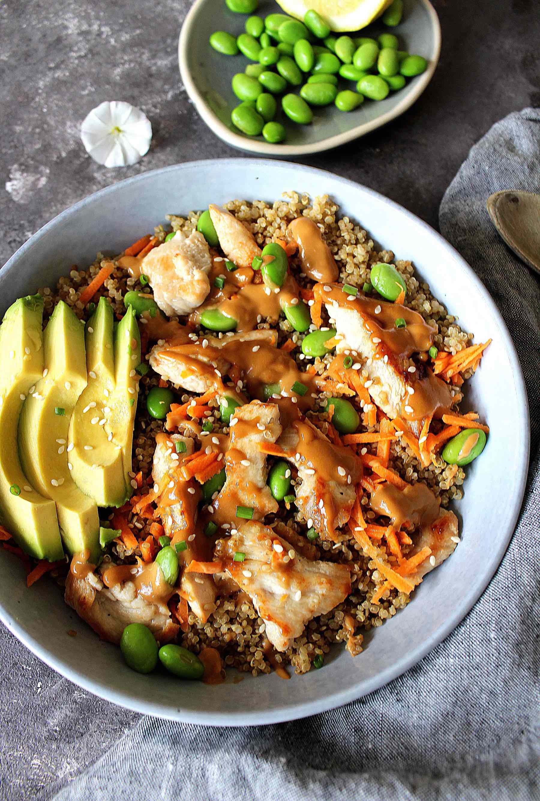 Disposez une généreuse couche de quinoa. Puis ajoutez la dinde, les carottes, l'edamame et l'avocat. Versez la sauce à la cacahuète par-dessus.
