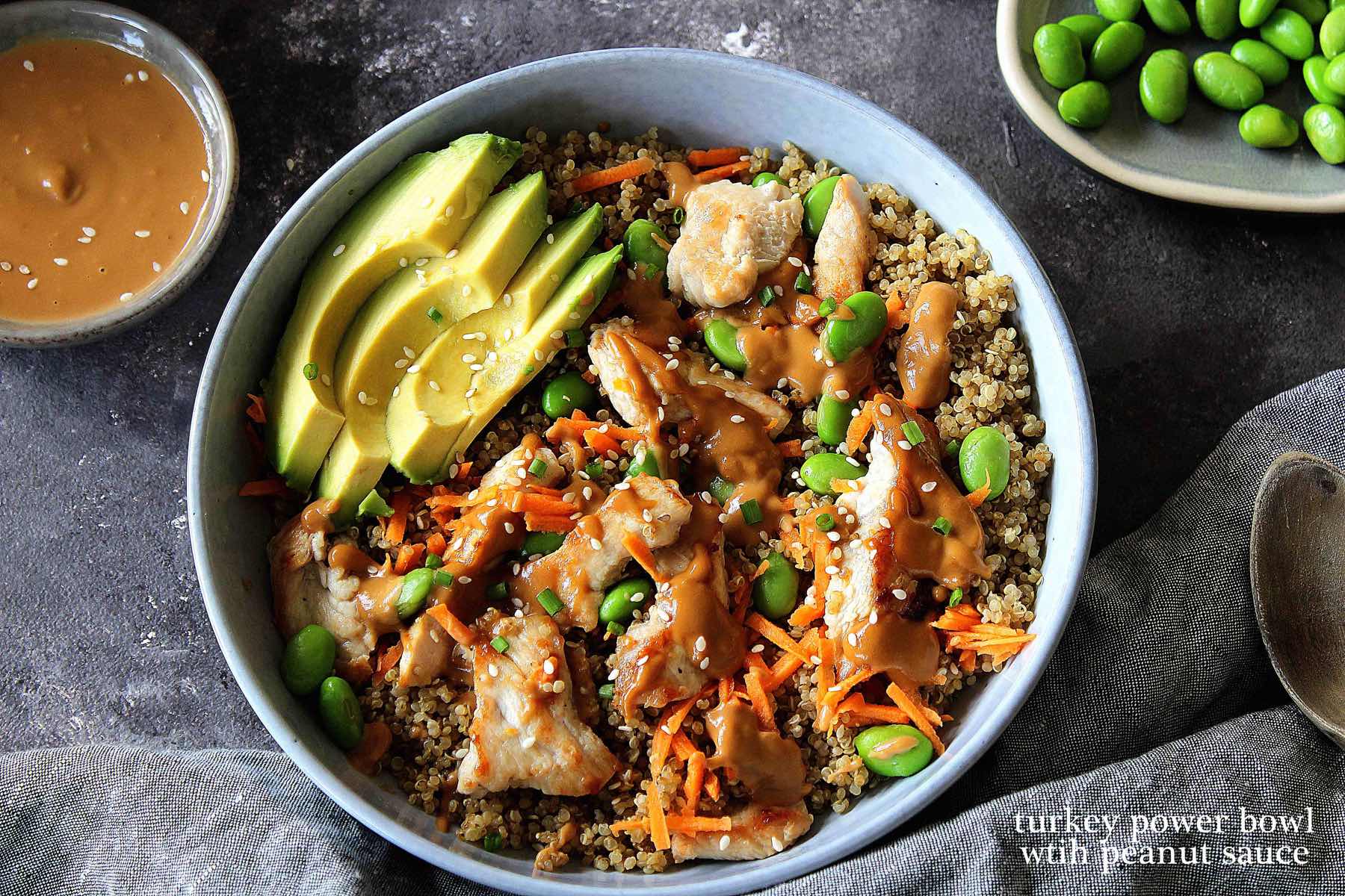 Ici j'ai fait un joli bowl à la dinde avec une sauce à la cacahuète. J'ai ajouté de l'edamame et de la carotte pour la texture et la couleur. Un peu d'avocat bien crémeux. Une bonne couche de quinoa pour ne pas avoir faim dans l'heure qui suit et nous voilà prêt à déguster ce power bowl. J'en ai fait un il y a quelques temps à la truite fumée si tu aimes le poisson!