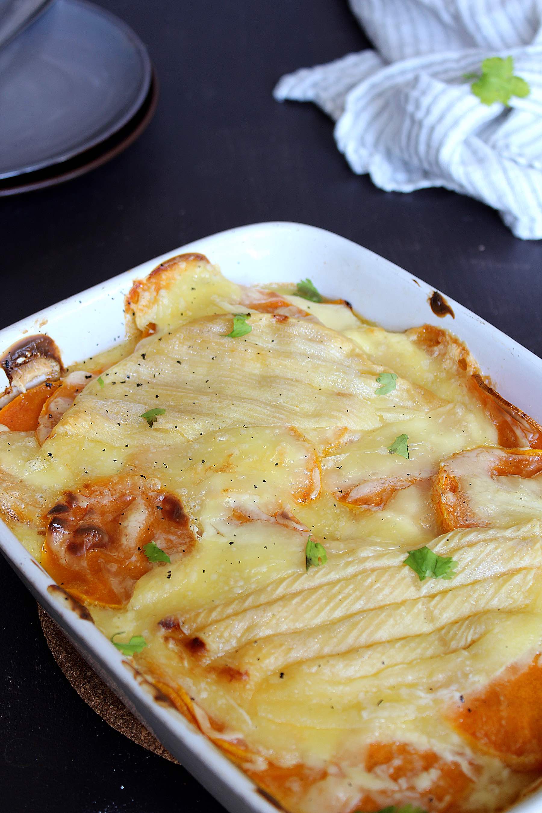 Une cool alternative à la tartiflette traditionnelle, on remplace les pommes de terre par de la courge butternut. Bien sûr, c'est un peu plus sucré que la vraie tartiflette mais c'est très bon et plutôt léger, contre toute attente!