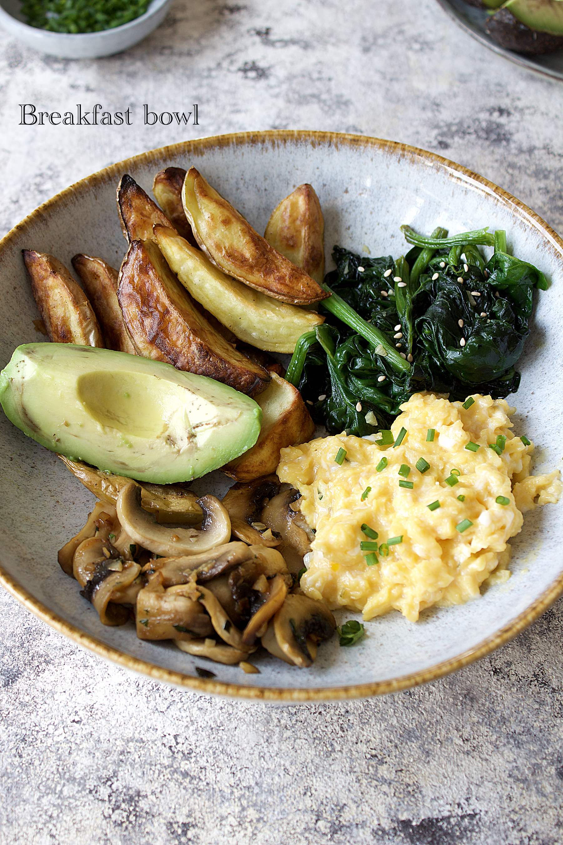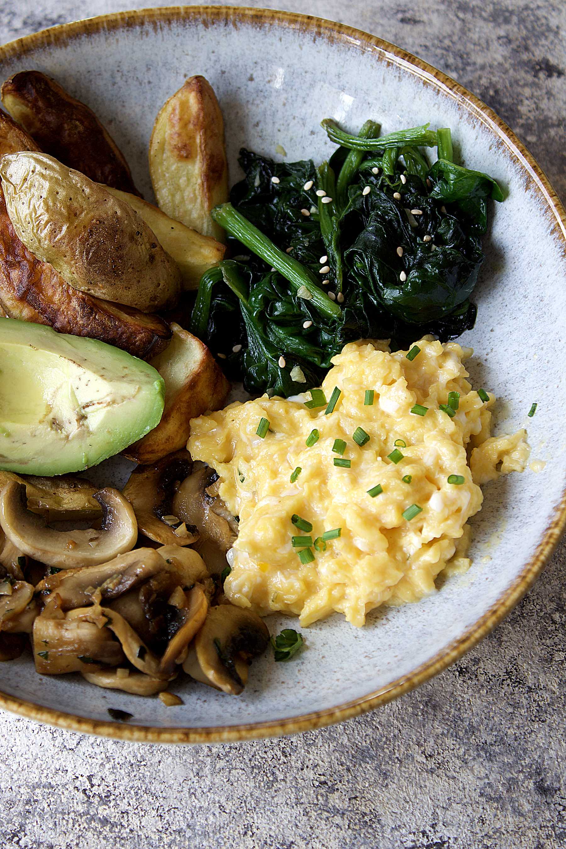 Ça c'est mon petit déjeuner de rêve mais bon, si on est réaliste 5 minutes, j'ai absolument pas le temps de faire ça la semaine. C'est pour ça que je l'ai appelé mon breakfast bowl du dimanche. Il y a tout ce que j'aime : des oeufs brouillés, des petits épinards, champignons, un peu d'avocat et des pommes de terre rôties.