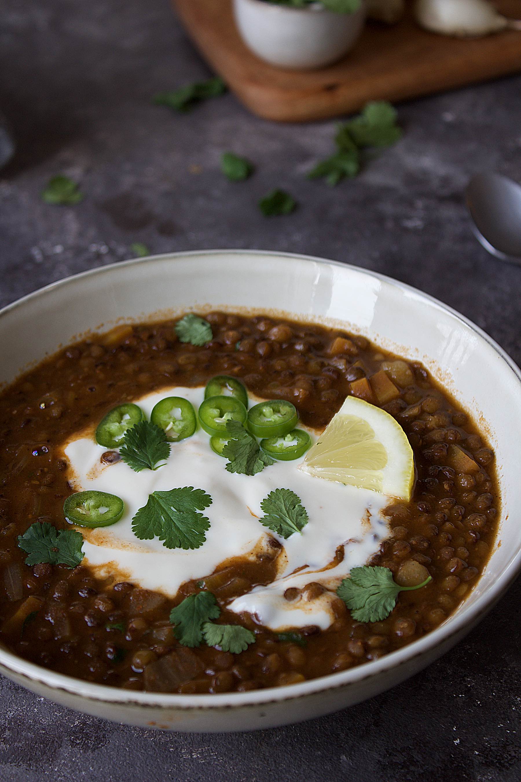 Un bon petit plat comme je les aime, mijoté tranquillement, pleins d'épices et de chaleur. J'aime beaucoup trop les lentilles et les mijotés. Alors forcément, on ne peut pas faire fausse route ici! Je vous présente donc ma petite soupe de lentilles épicée, avec des tomates, des carottes et pleins de bons épices. J'ai tout donné sur les toppings aussi avec du yaourt de coco, des petits piments jalapeño et beaucoup (plus que sur la photo) de coriandre.