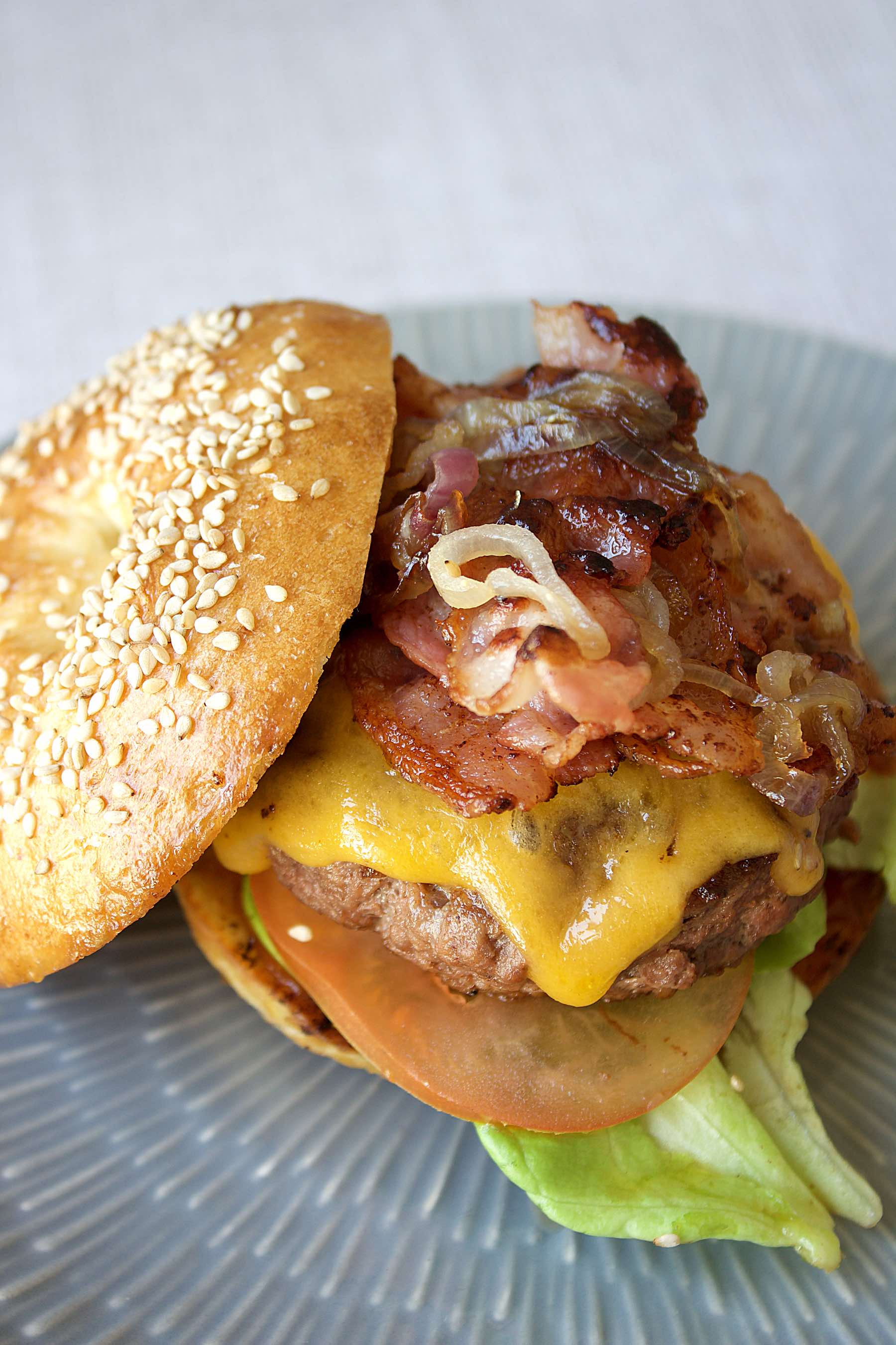 Du coup, ni une ni deux, j'ai réutilisé les pains à bagel pour en faire des burgers. J'ai utilisé une garniture plutôt simple : steak assaisonné à l'ail et au thym, du cheddar, un peu de tomates et de laitue, des échalotes caramélisées et du bacon bien croustillants.