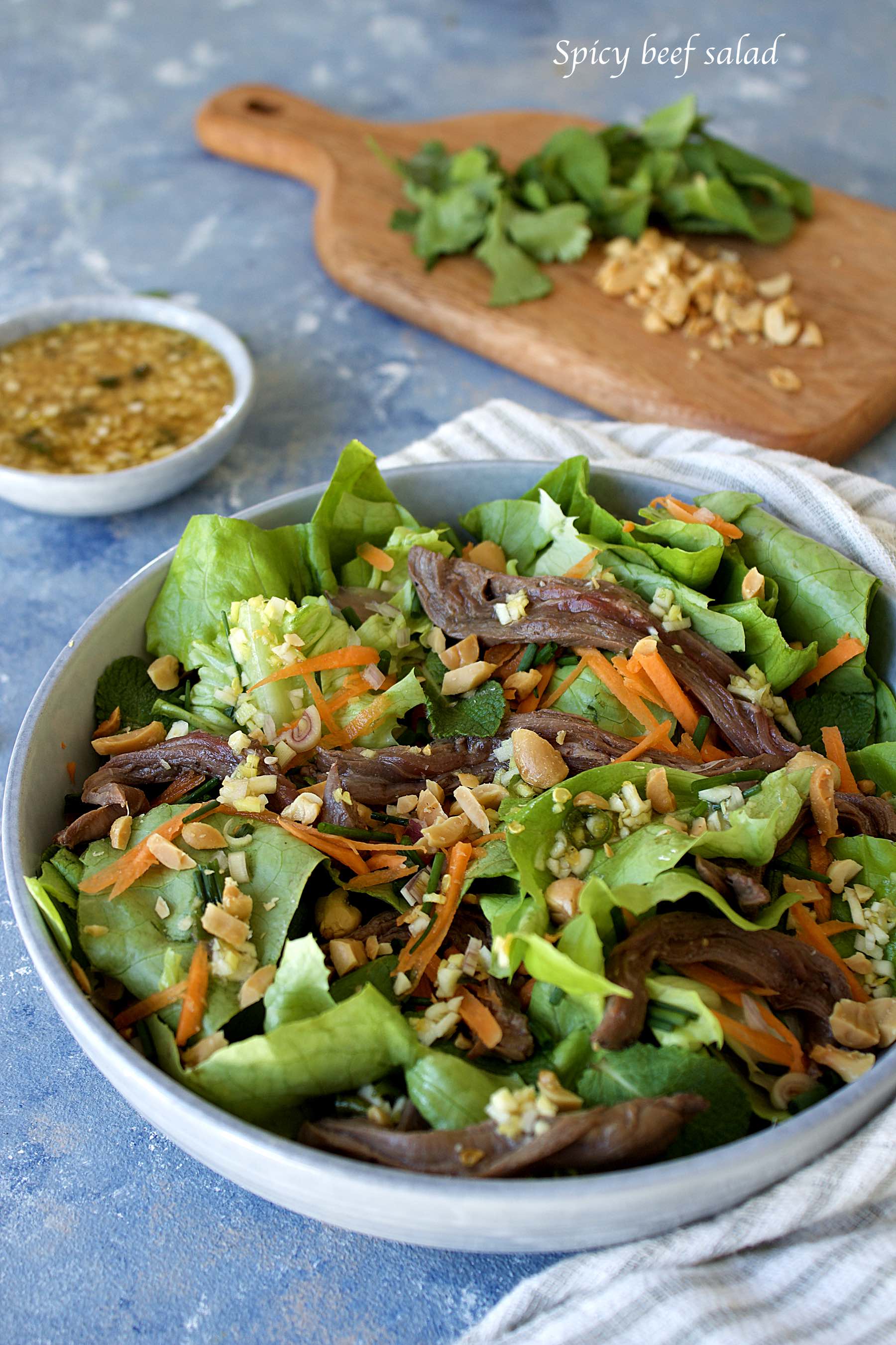 Inspirée de la bien célèbre salade de boeuf crue et marinée, j'ai fait cette petite salade qui était très très bonne. La sauce est bien pimentée et relève bien le tout, mettez un seul piment si vous n'êtes pas habitué!