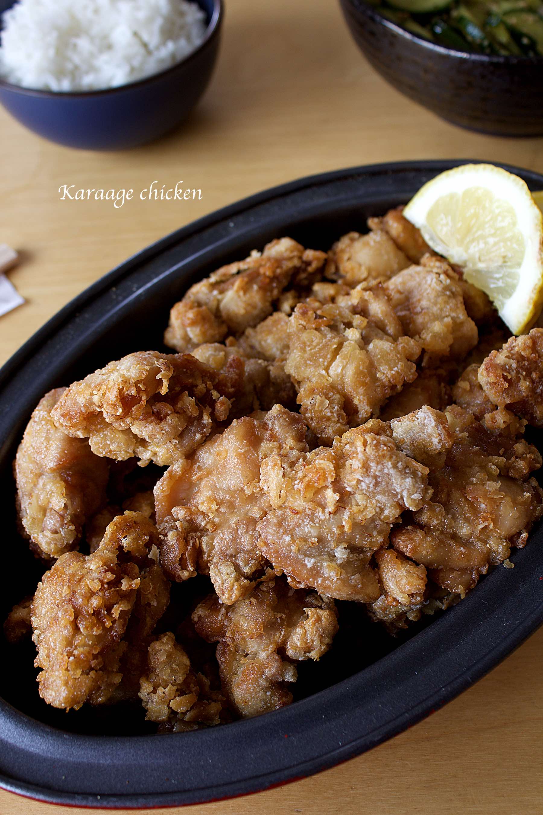Ensuite on l'enrobe de fécule de maïs et on le frit deux fois. 1 fois pour cuire le poulet, 1 fois pour le faire croustiller encore plus. Et c'est tellement, mais tellement bon. J'ai servi ça avec un petit bol de riz, une salade de concombre au sésame et du jus de citron. Un vrai régal.