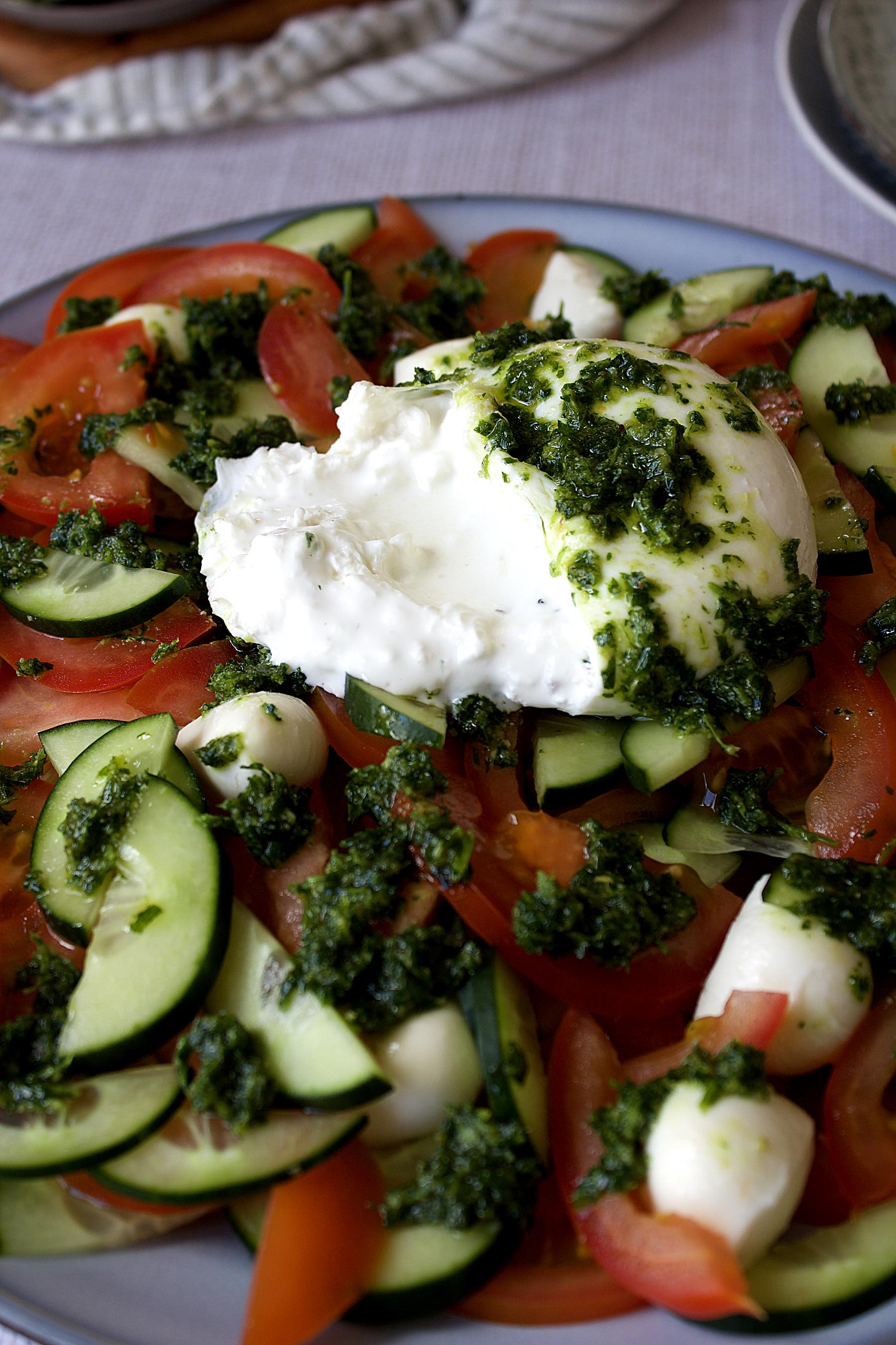 Salade de tomate, concombre et mozzarella à la persillade (2-3 personnes) :