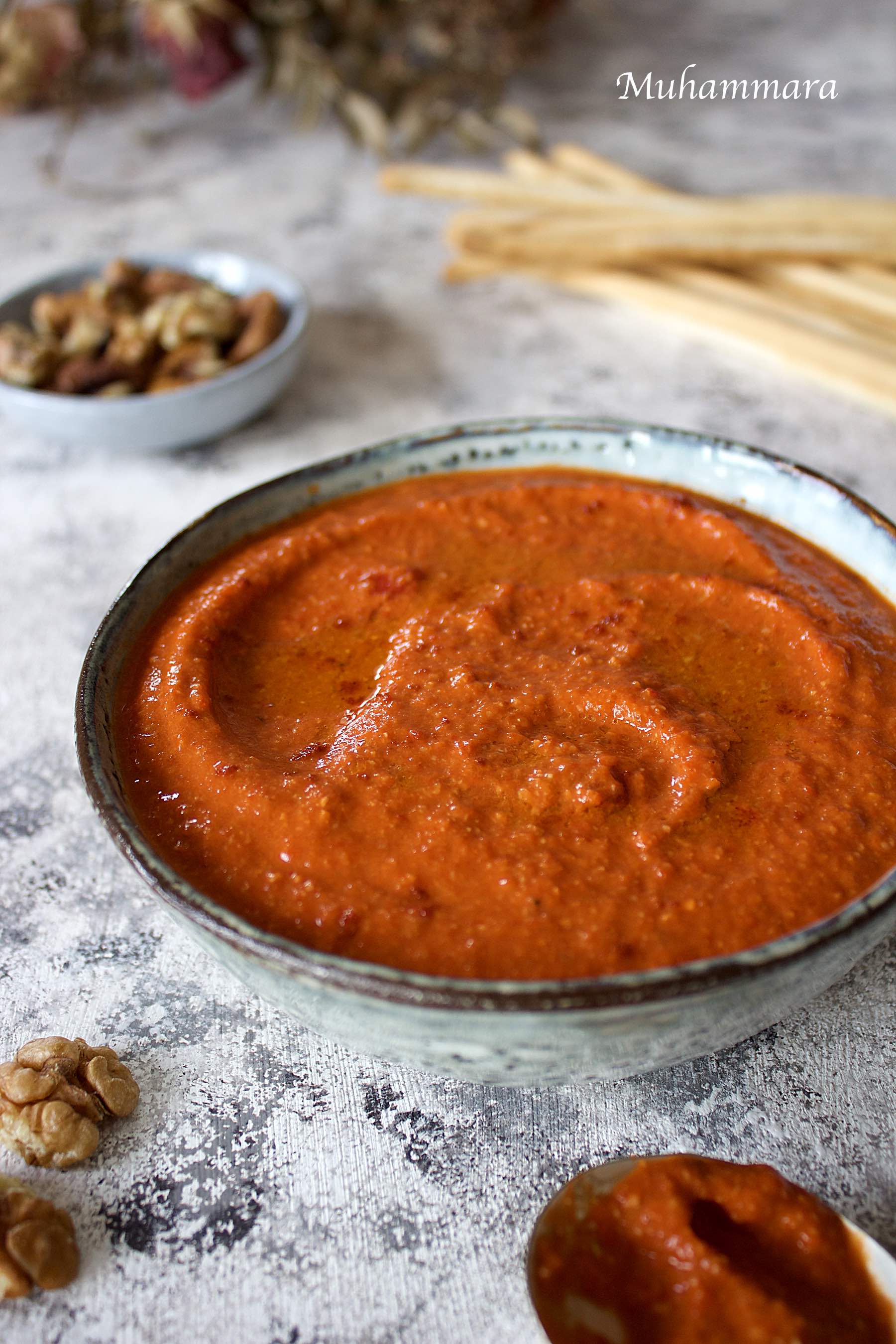 La muhammara c'est un dip aux poivrons et aux noix qu'on trouve beaucoup en Turquie, il peut être bien mixé comme ici ou en morceaux hachés finement également c'est au choix. On ajoute quelques épices, beaucoup d'ail et c'est un régal.