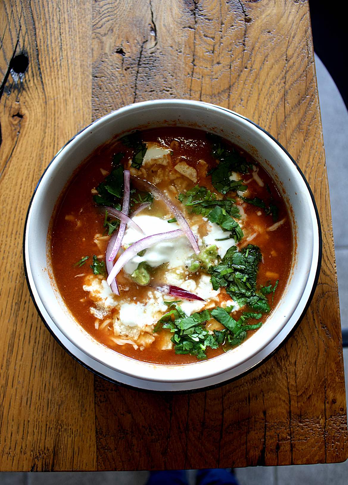 La soupe aztèque : un bouillon à la tomate, du fromage, de la tortilla, de l'avocat, de la crème et de la coriandre. Tout ça un petit peu pimenté, épicé comme il faut. C'était très bon et super réconfortant. Attention, ce plat n'est à la carte qu'en automne et en hiver, il est remplacé par un ceviche quand il fait beau au printemps et en été. (6,50€)