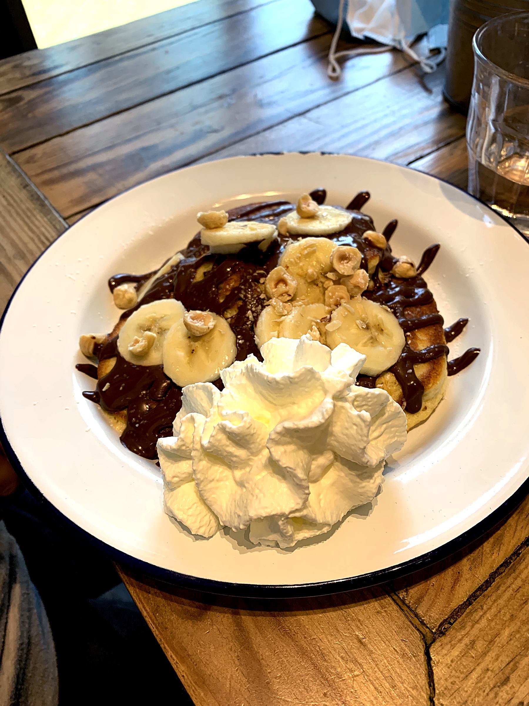 Ma fille a commandé les pancakes au nutella, bananes, crème fouettée et noisettes (9,5€), bien gourmand et copieux ! Elle a adoré, j'ai picoré dans son assiette c'était top.