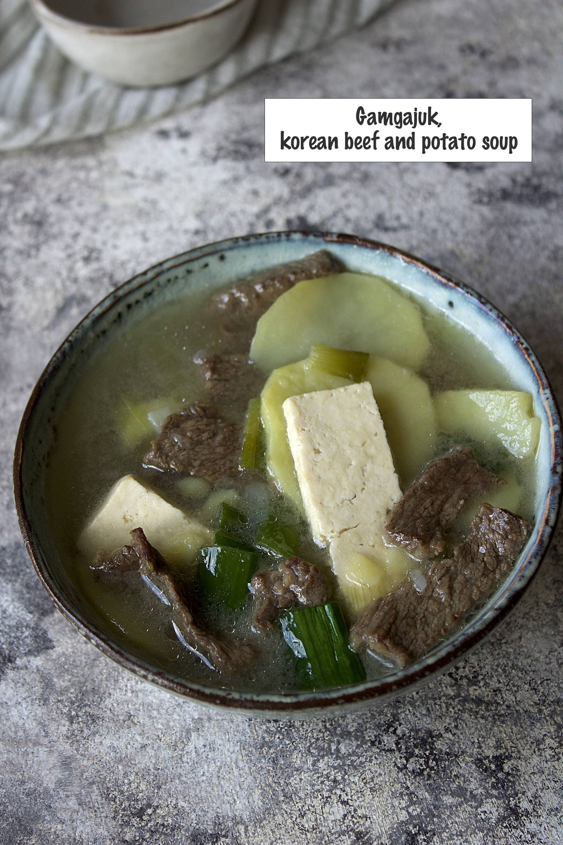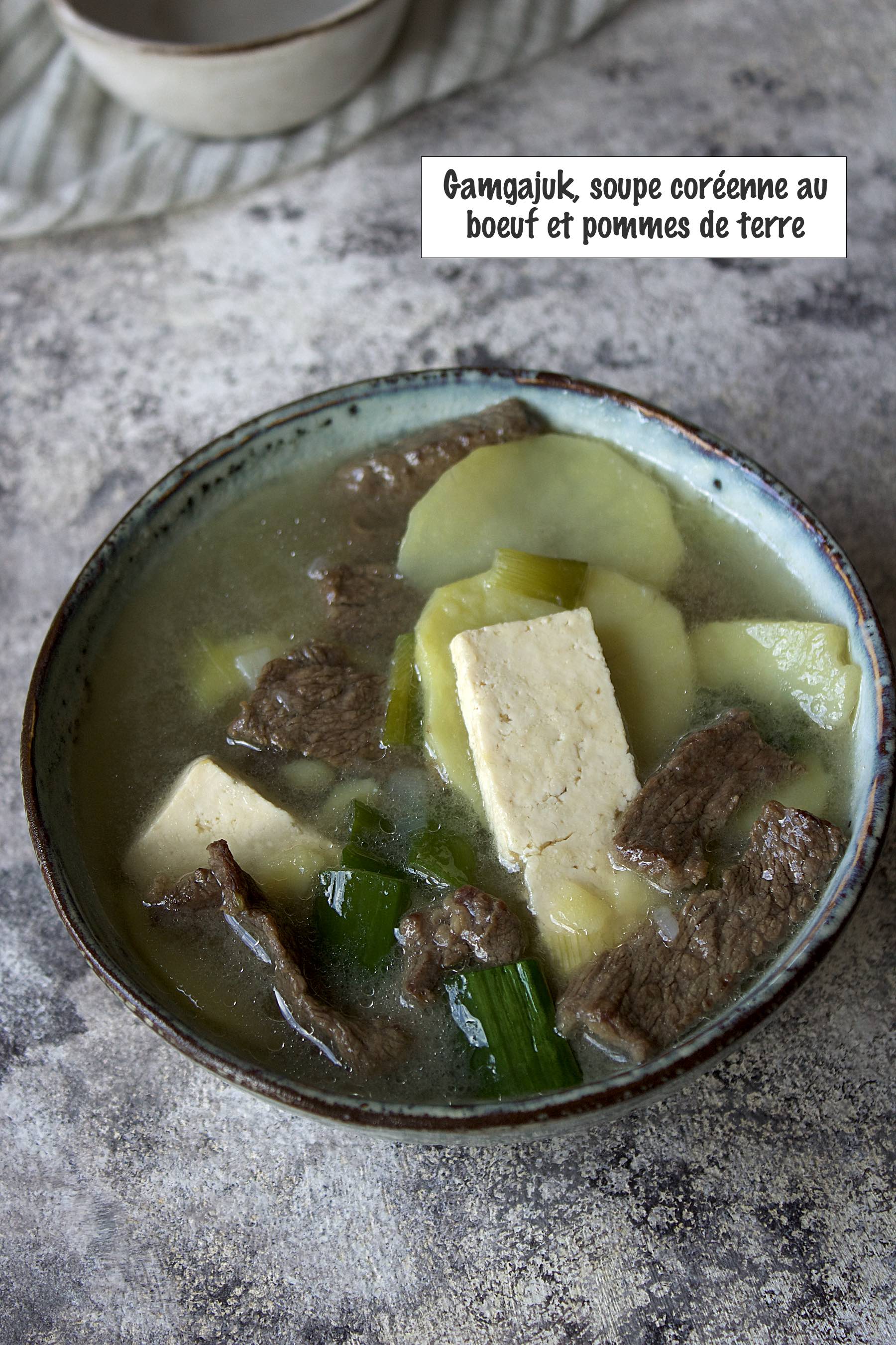 Le gamjaguk est une soupe coréenne avec une base de bouillon clair, du boeuf émincé et des pommes de terre. On peut également y ajouter des nouilles et du tofu, j'ai uniquement mis du tofu parce que c'est déjà bien rassasiant comme ça.