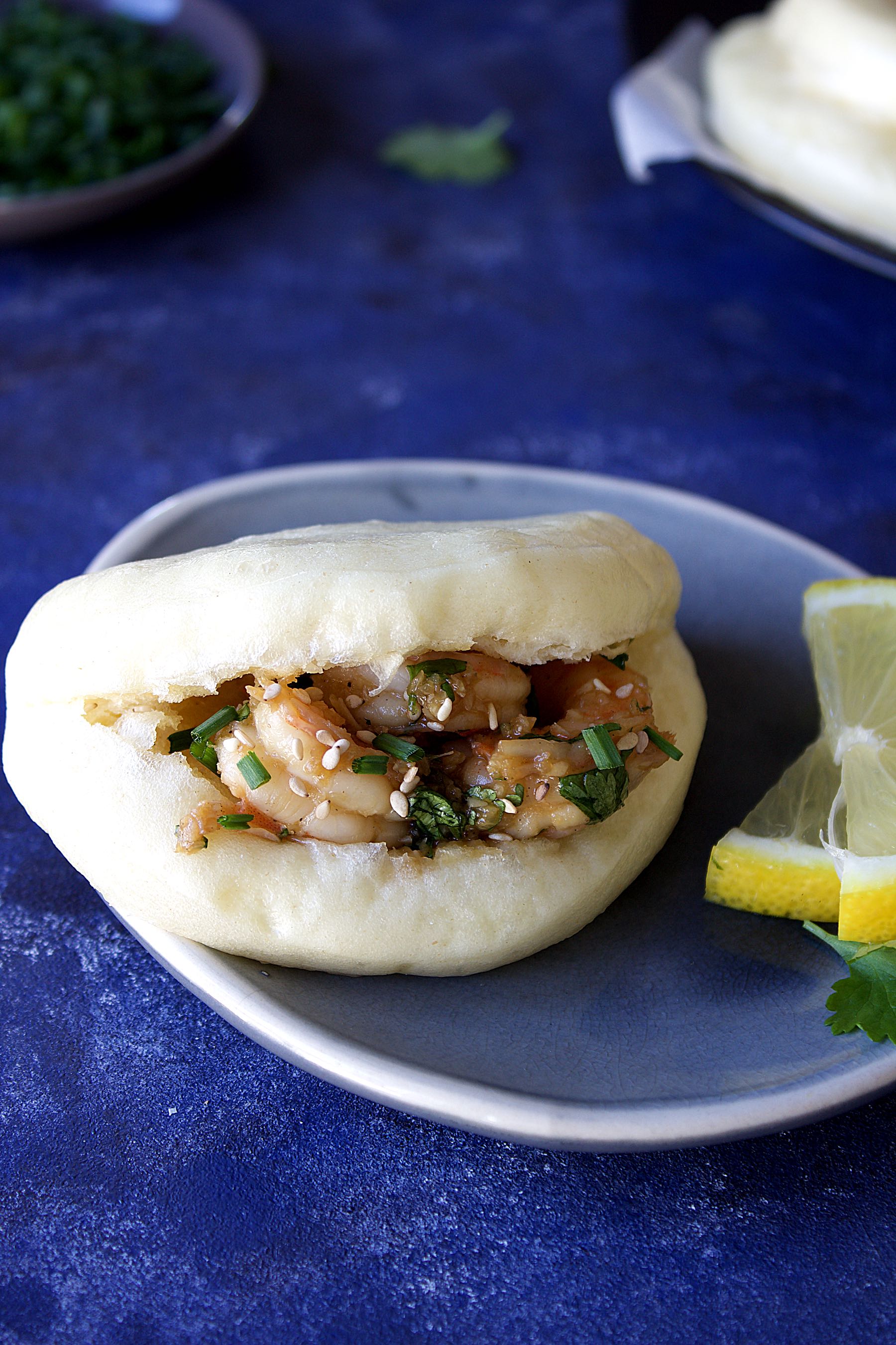 Garnissez les gua bao de crevettes, ajoutez de la ciboulette ciselée, un trait de citron et dégustez!