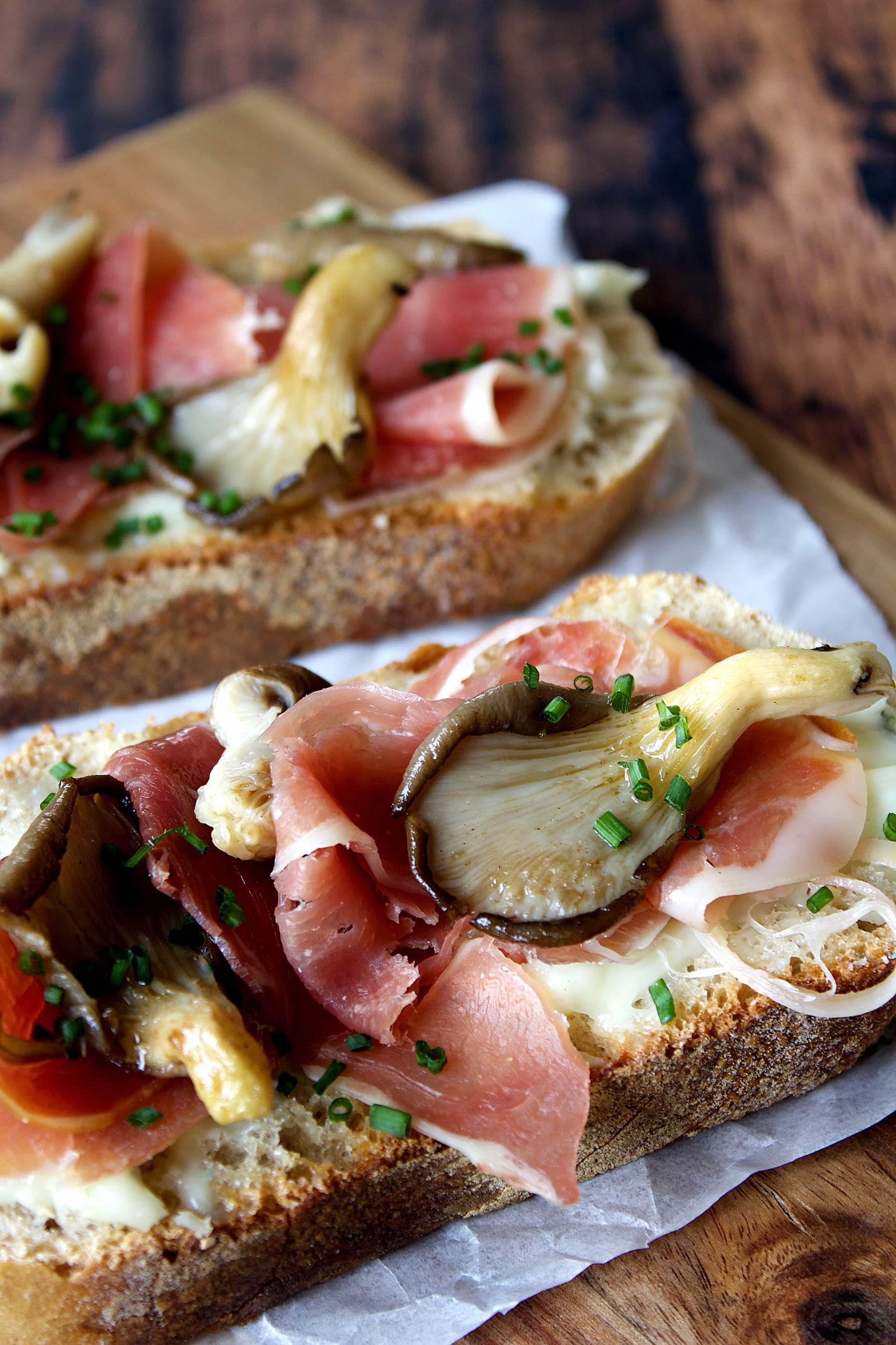 Avec du gorgonzola bien bien crémeux, un pain au levain qui croustille, du jambon cru et des pleurotes bien dorées, ça fait vraiment le job pour un repas de midi préparé en moins de 10 minutes.