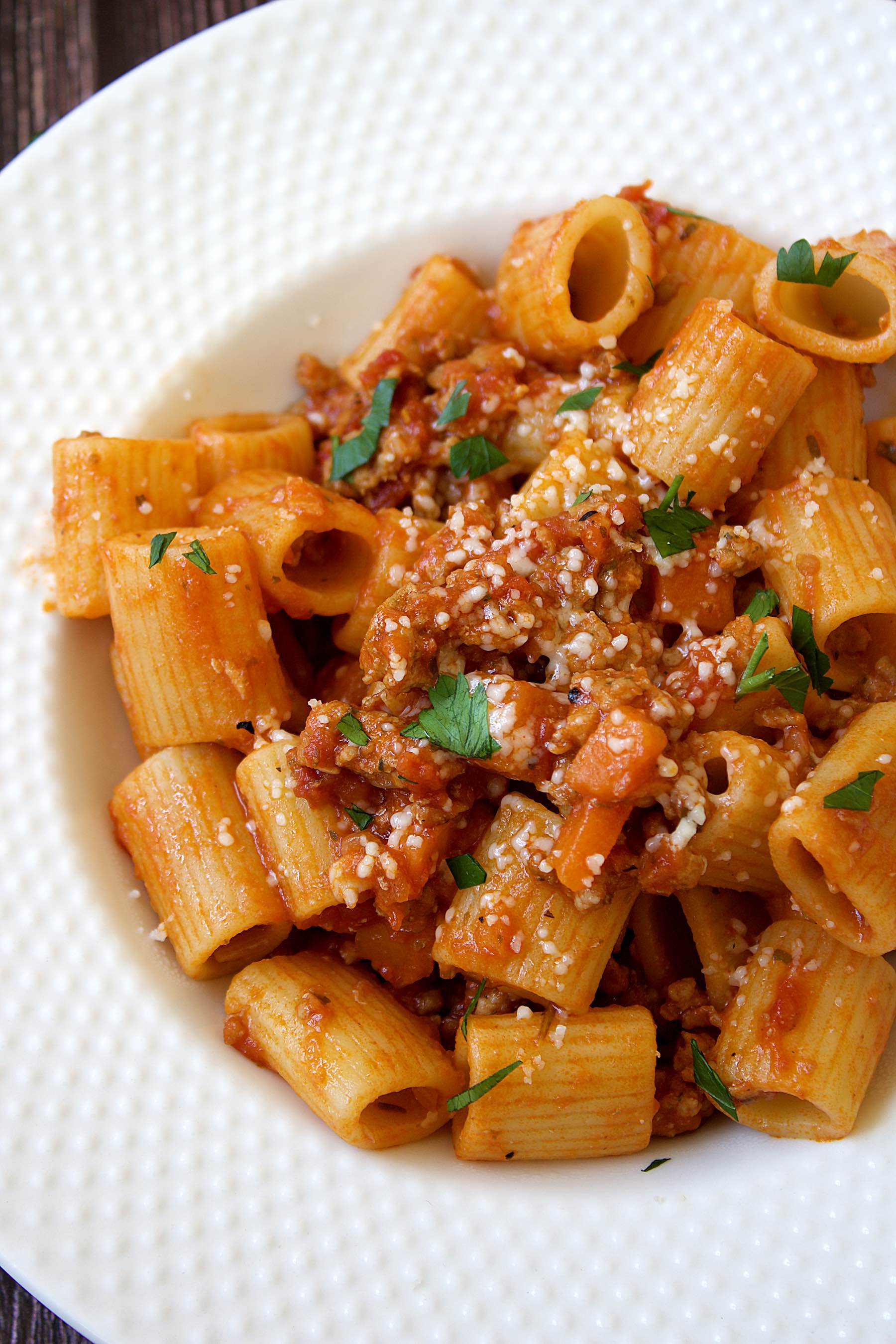 Une recette bien réconfortante de pâtes à la sauce tomate avec un petit twist : de la chair à saucisse au lieu du boeuf pour un résultat 100% gourmand. Un peu comme une bolognaise mais légèrement différent.