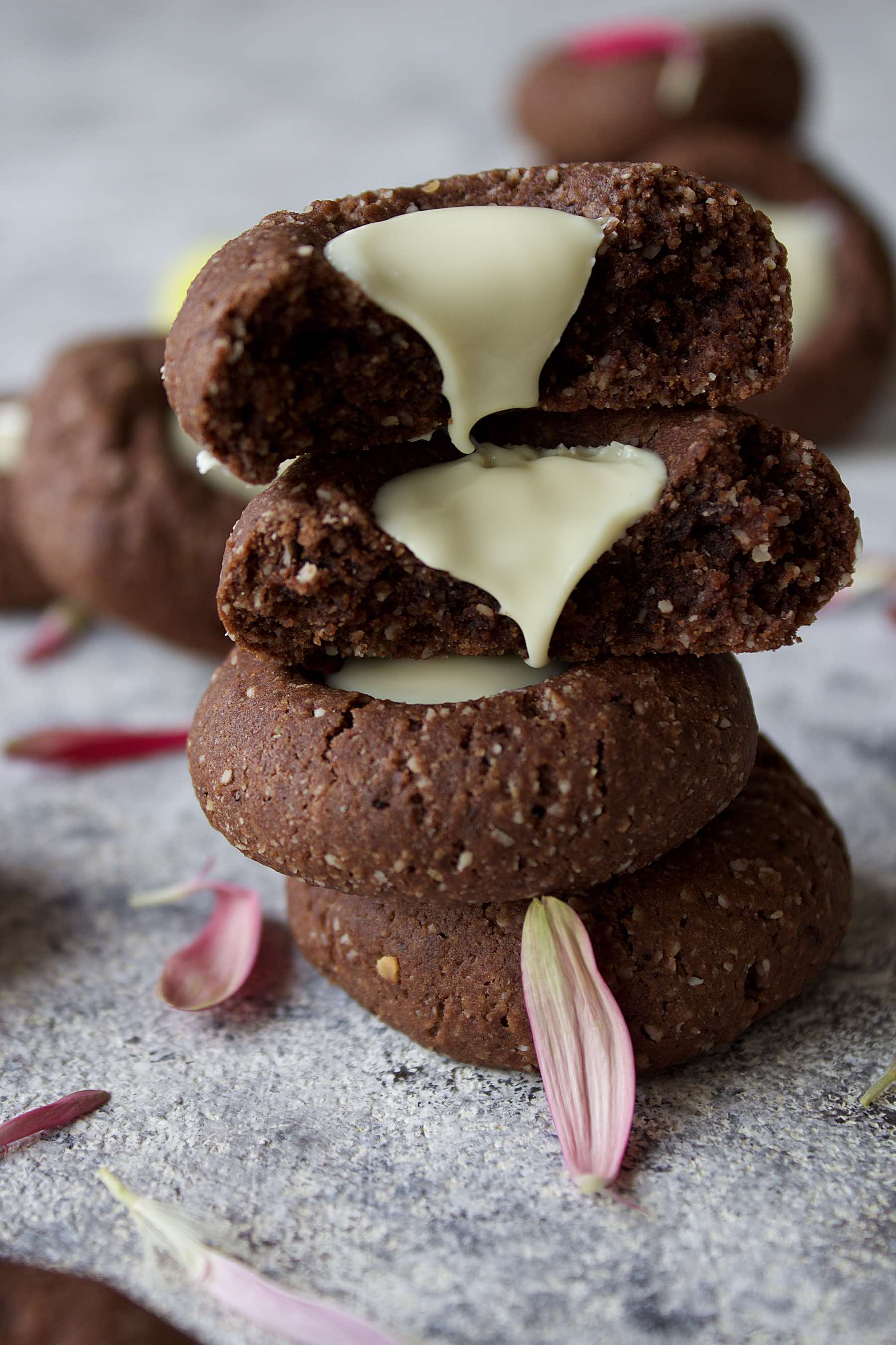 Des petits gâteaux bien cacaotés, pas très sucrés, sans oeufs ni beurre. La poudre d'amande leur donne une jolie texture et une bonne croustillance. Ils sont ensuite remplis d'un coeur au chocolat blanc qui apporte du sucre et de la gourmandise !