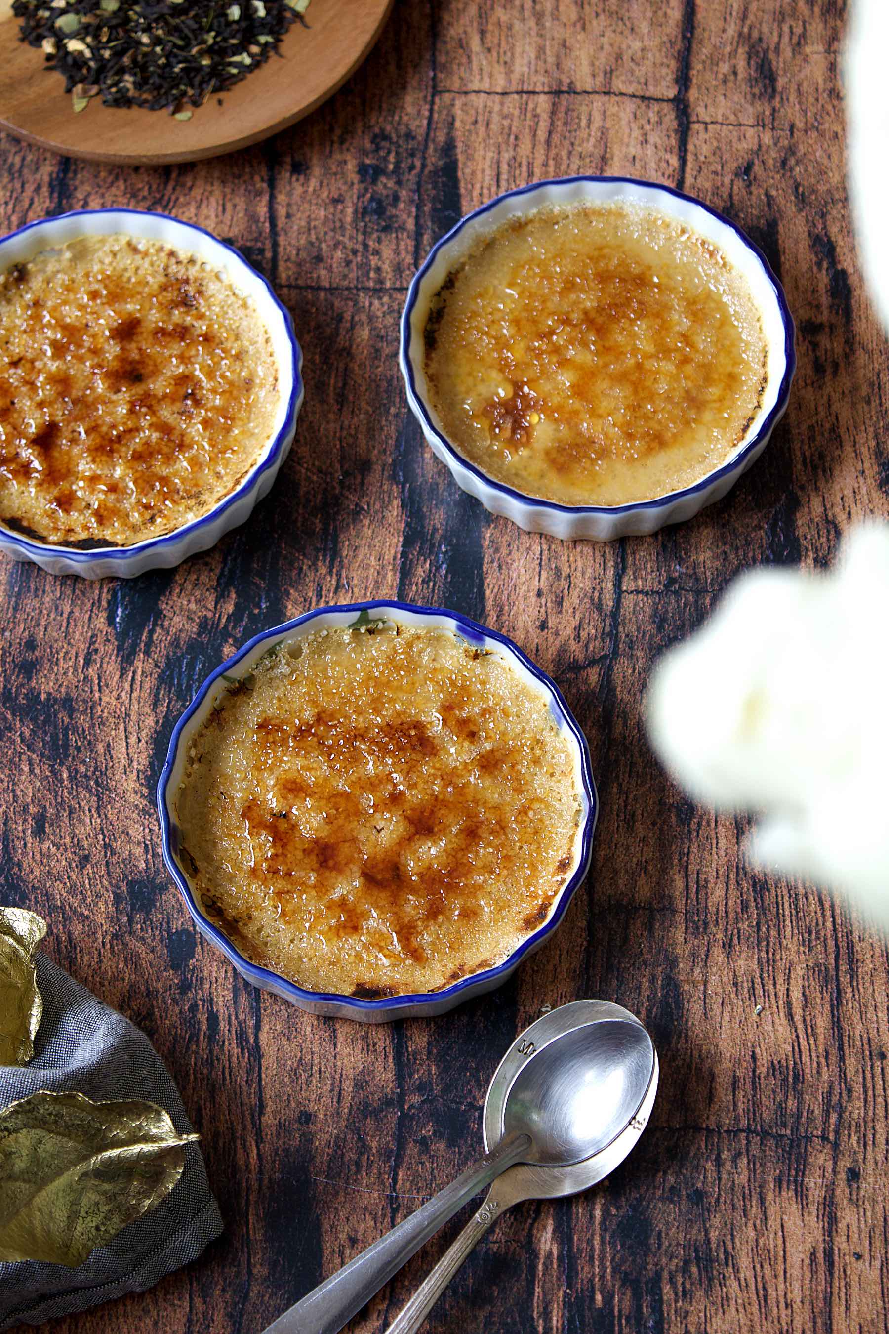 J'adore le chaï masala en boisson latte alors j'ai eu envie de l'infuser dans le lait de ma crème brûlée et c'était vraiment délicieux. Je vous recommande chaudement d'essayer. Par contre, attendez le dernier moment pour caraméliser le sucre puisque l'humidité le rendra tout mou si vous le faites en avance.