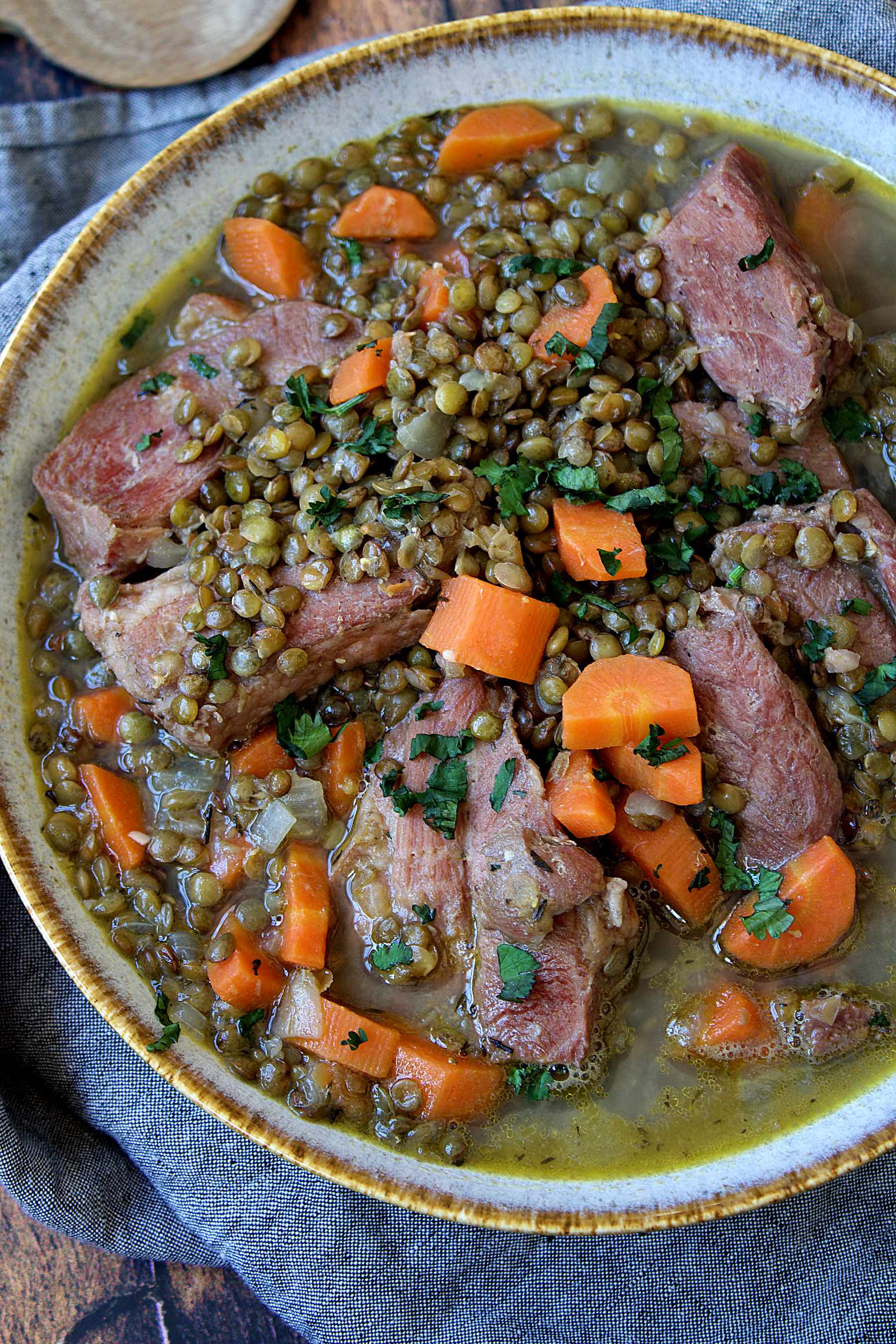 Qu'est-ce que c'est réconfortant un bon plat de lentilles... Et avec de l'échine salée c'est encore meilleur ! Un plat un peu comme un petit salé aux lentilles, qui cuit tranquillement et qui se mange bien chaud avec du pain croustillant et un peu de moutarde.