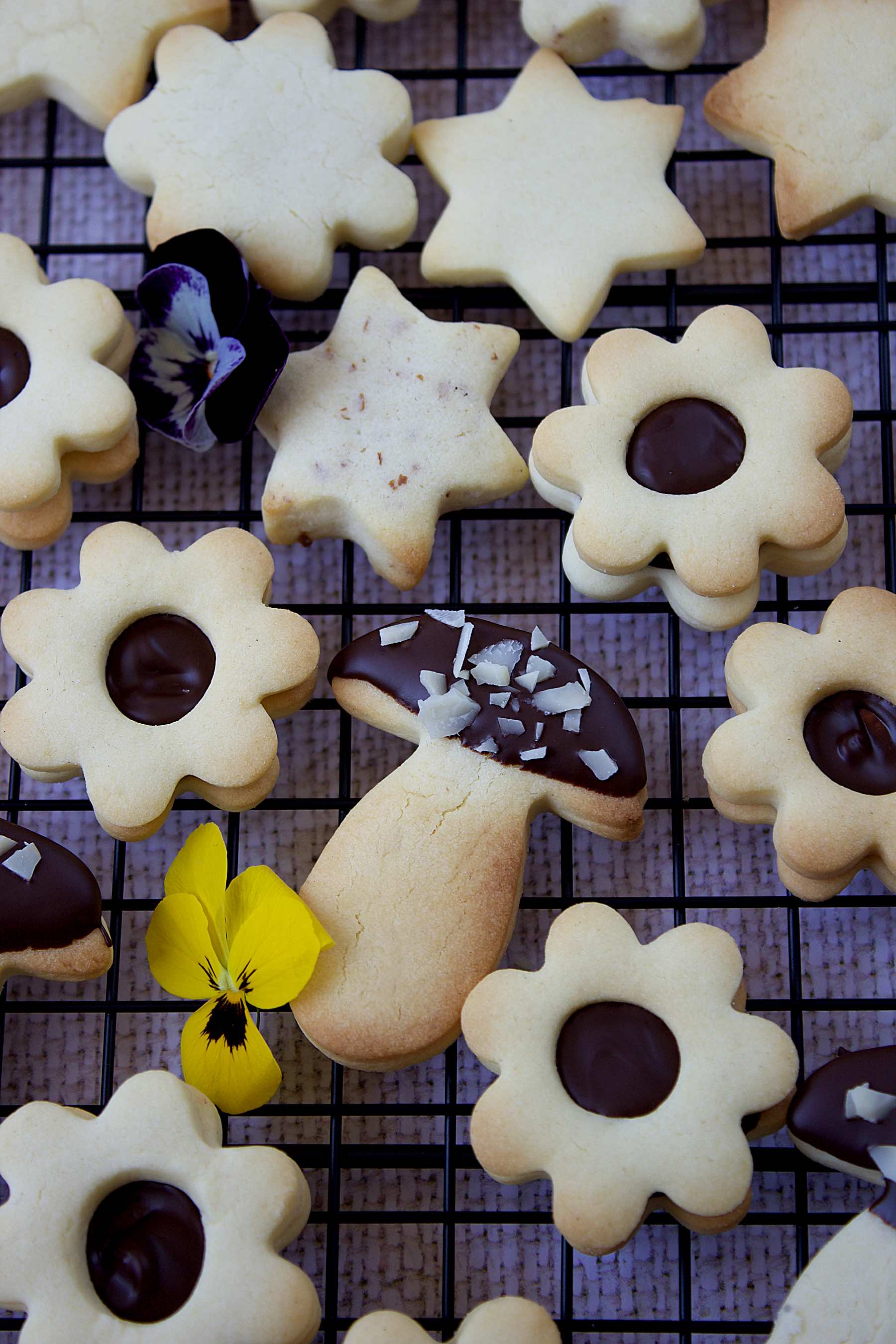 Vous pouvez utiliser les emporte-pièces de votre choix. Vous pouvez cliquez sur les liens suivants pour voir les miens. J'ai fait des petits champignons au chocolat et aux amandes concassées, des fleurs fourrés au chocolat et des étoiles natures !