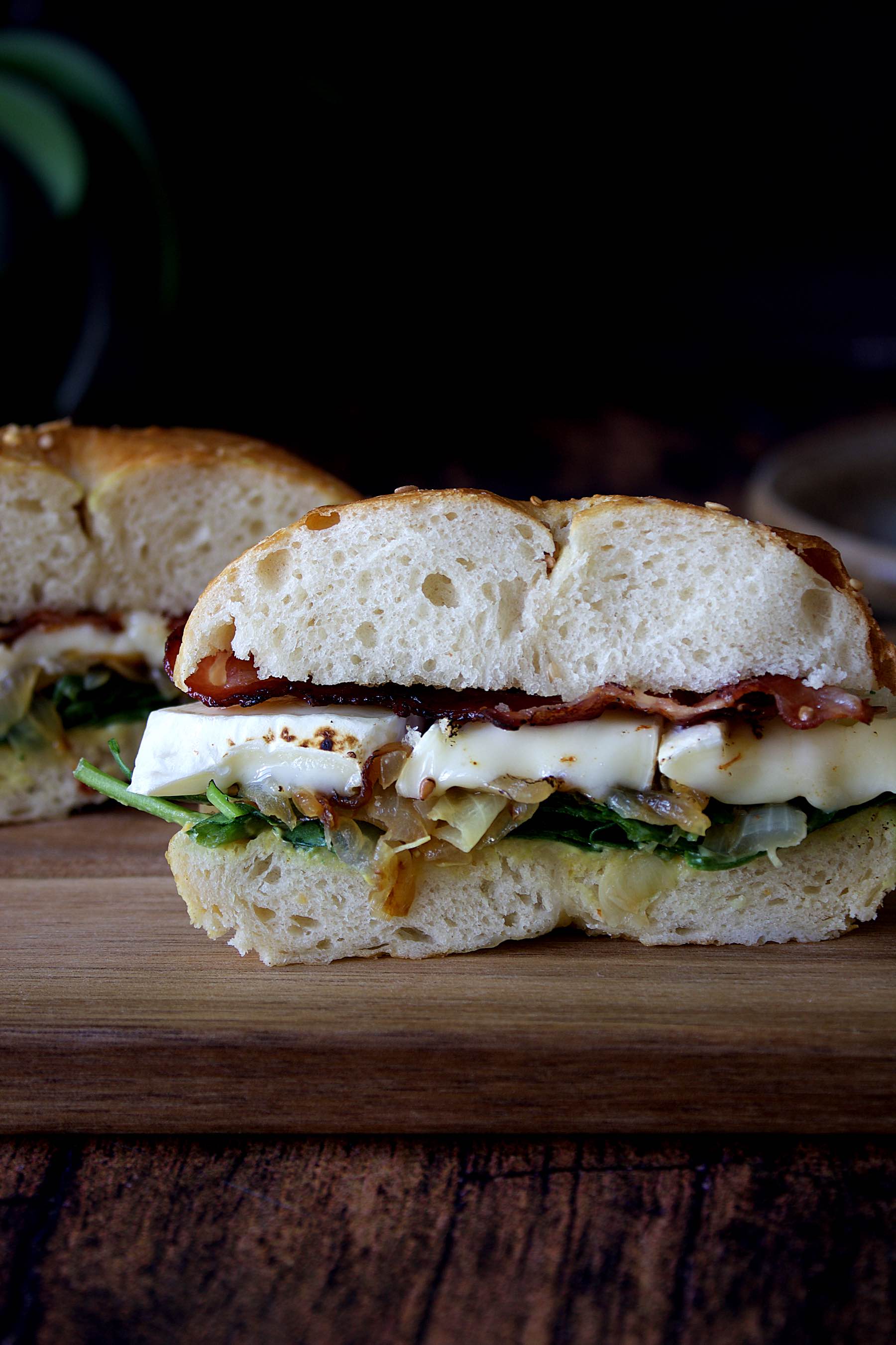Un bon petit bagel fait maison, aussi délicieux que dans votre bagel shop préféré et avec une recette un petit peu originale : du brie, du bacon et des oignons caramélisés, tout ça avec un peu de moutarde et d'épinards. Ça fait un déjeuner léger mais gourmand !